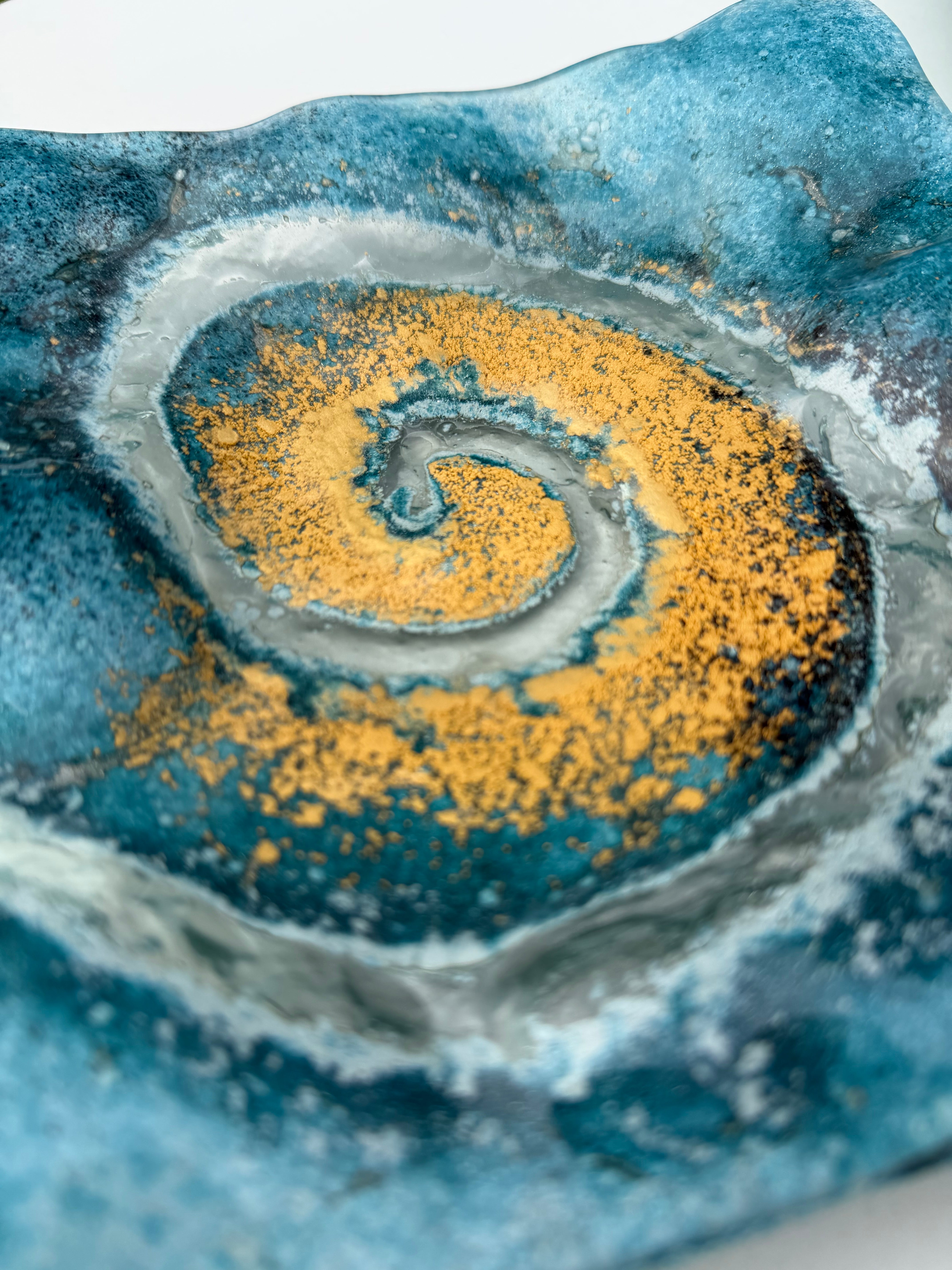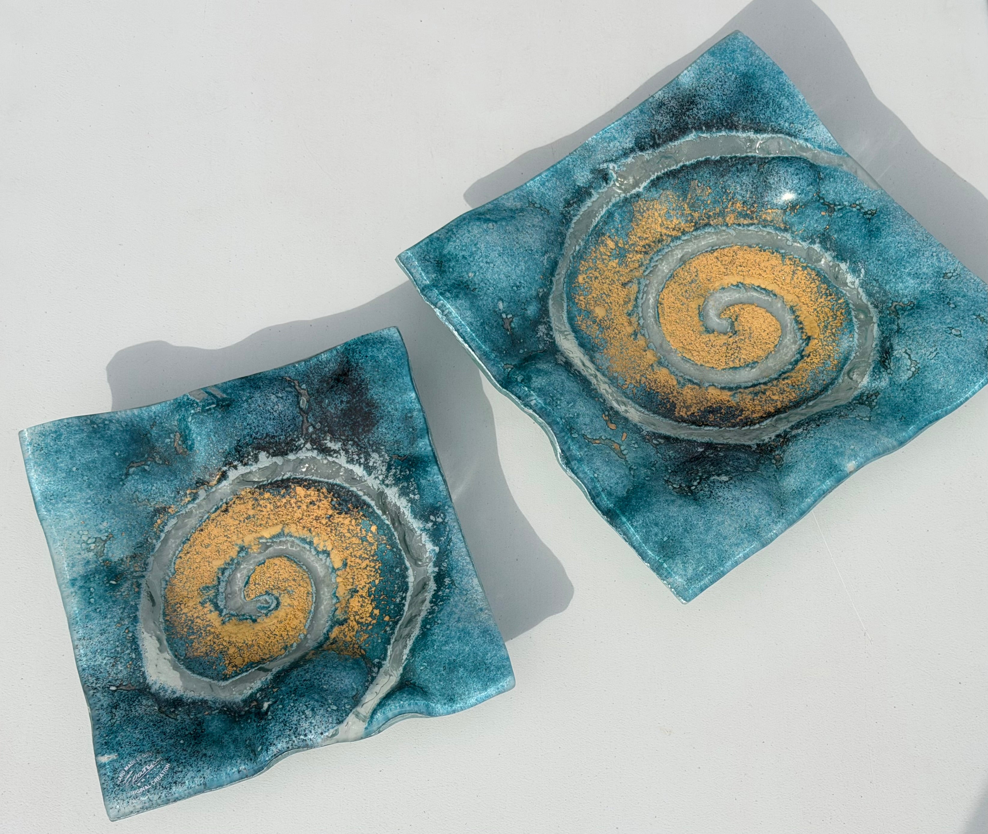These stunning fused glass plates from our Blue & Gold Collection feature swirling ocean-inspired designs with shimmering golden accents. Handcrafted with care, each piece captures the movement and depth of water through rich turquoise tones and textured glass surfaces. Perfect as decorative centrepieces or artful serving dishes, they bring a touch of coastal elegance and sophistication to any space.