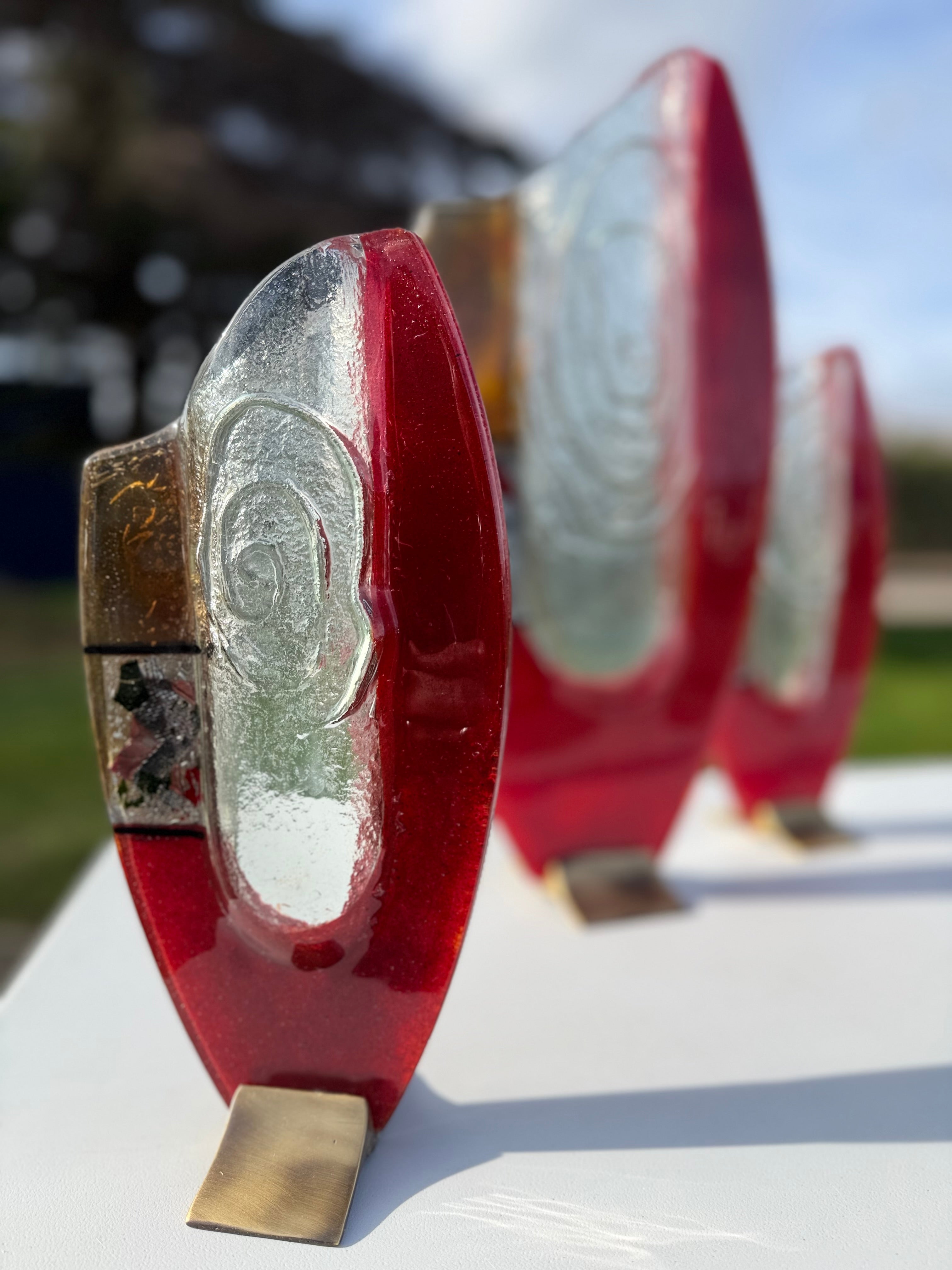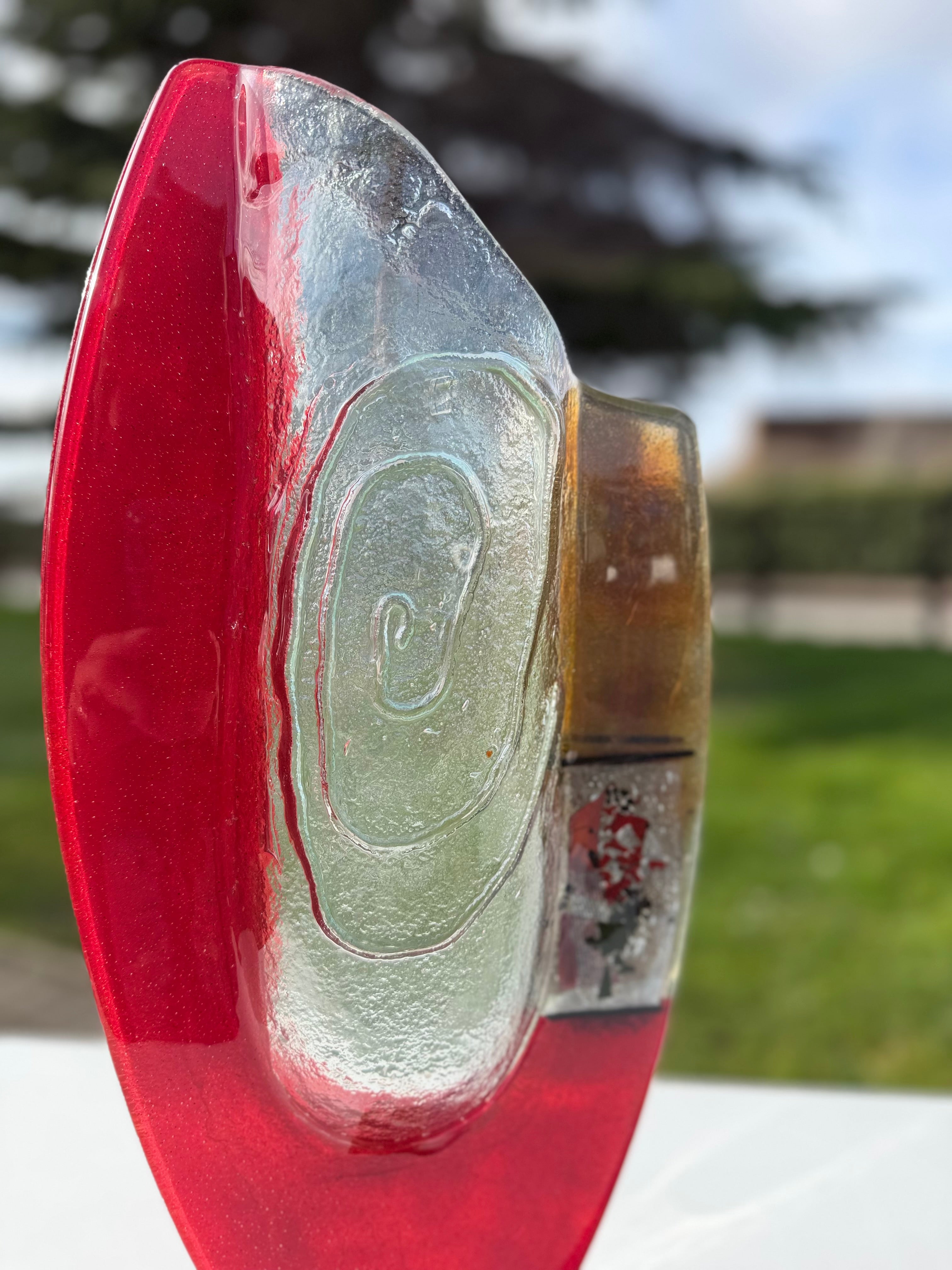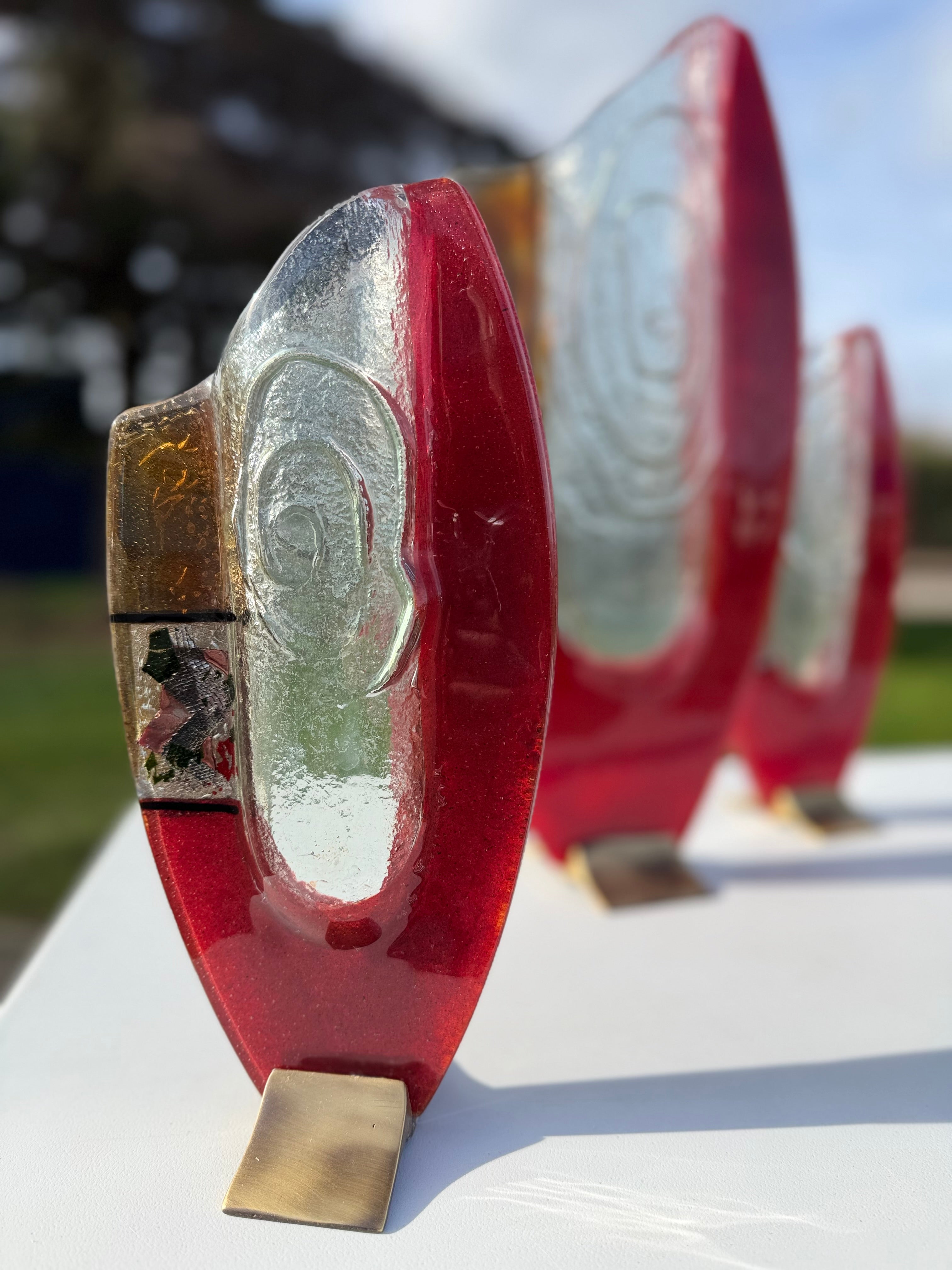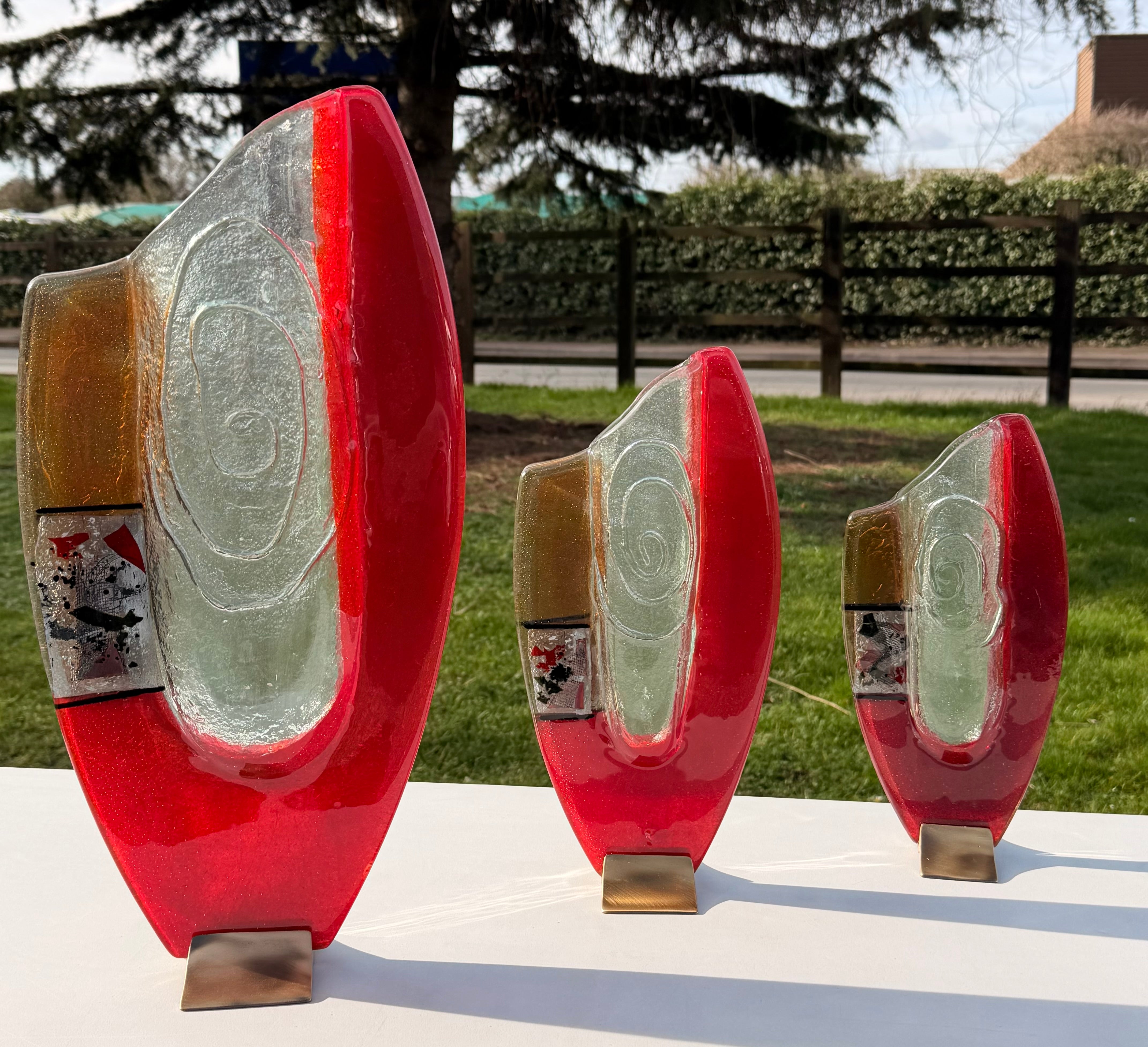 These beautiful vases are part of our Artemis collection. An elegant combination of red, white and pale orange fused glass. The colours are separated by a central transparent piece of glass that brings a dimension of style and glamour to this handcrafted fused glass ornament.