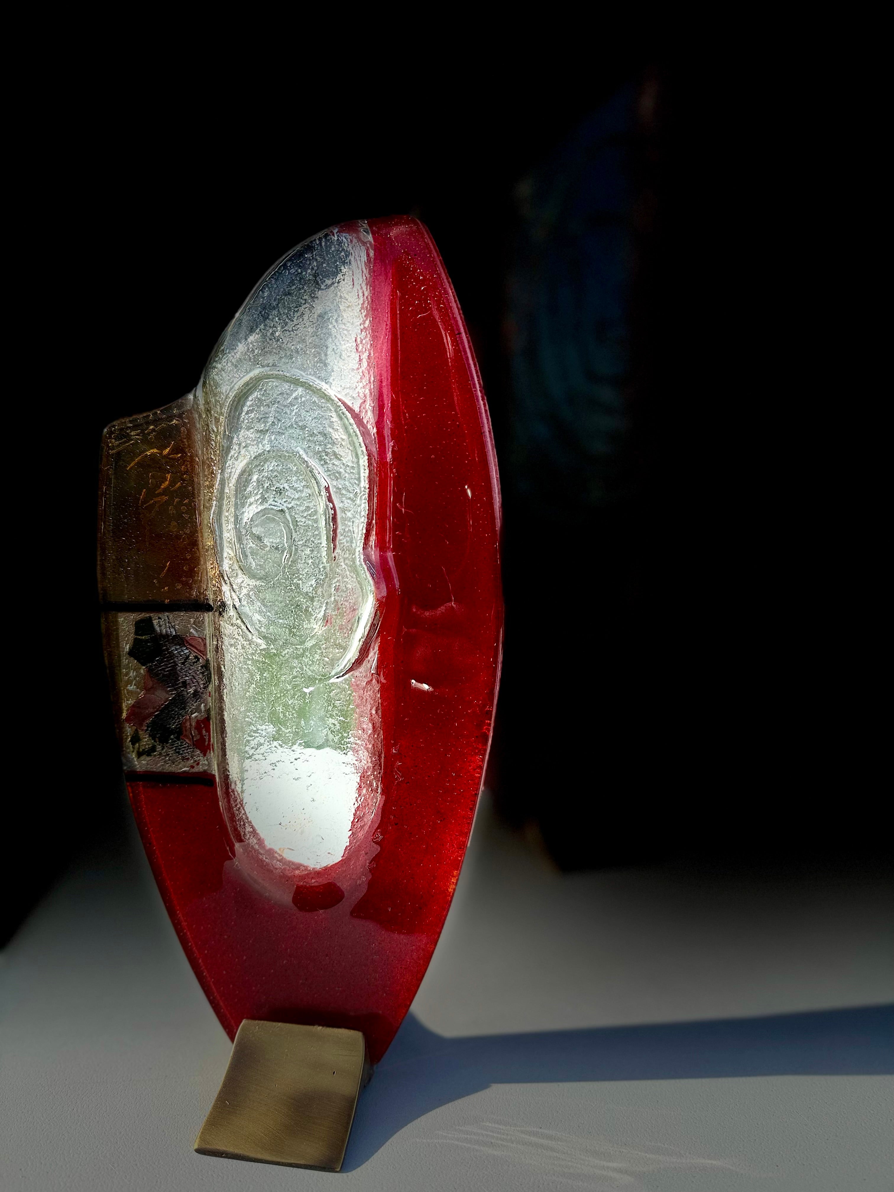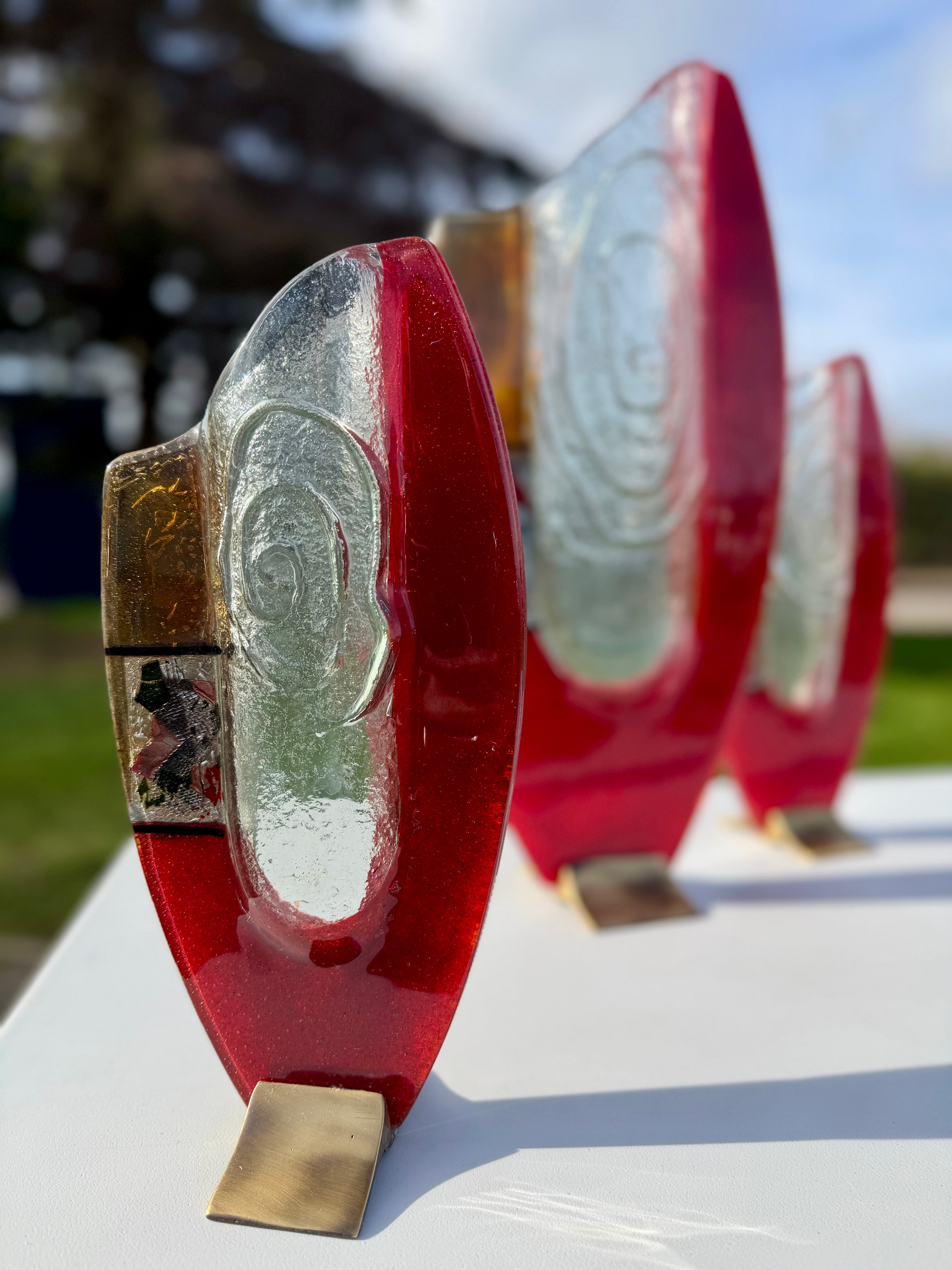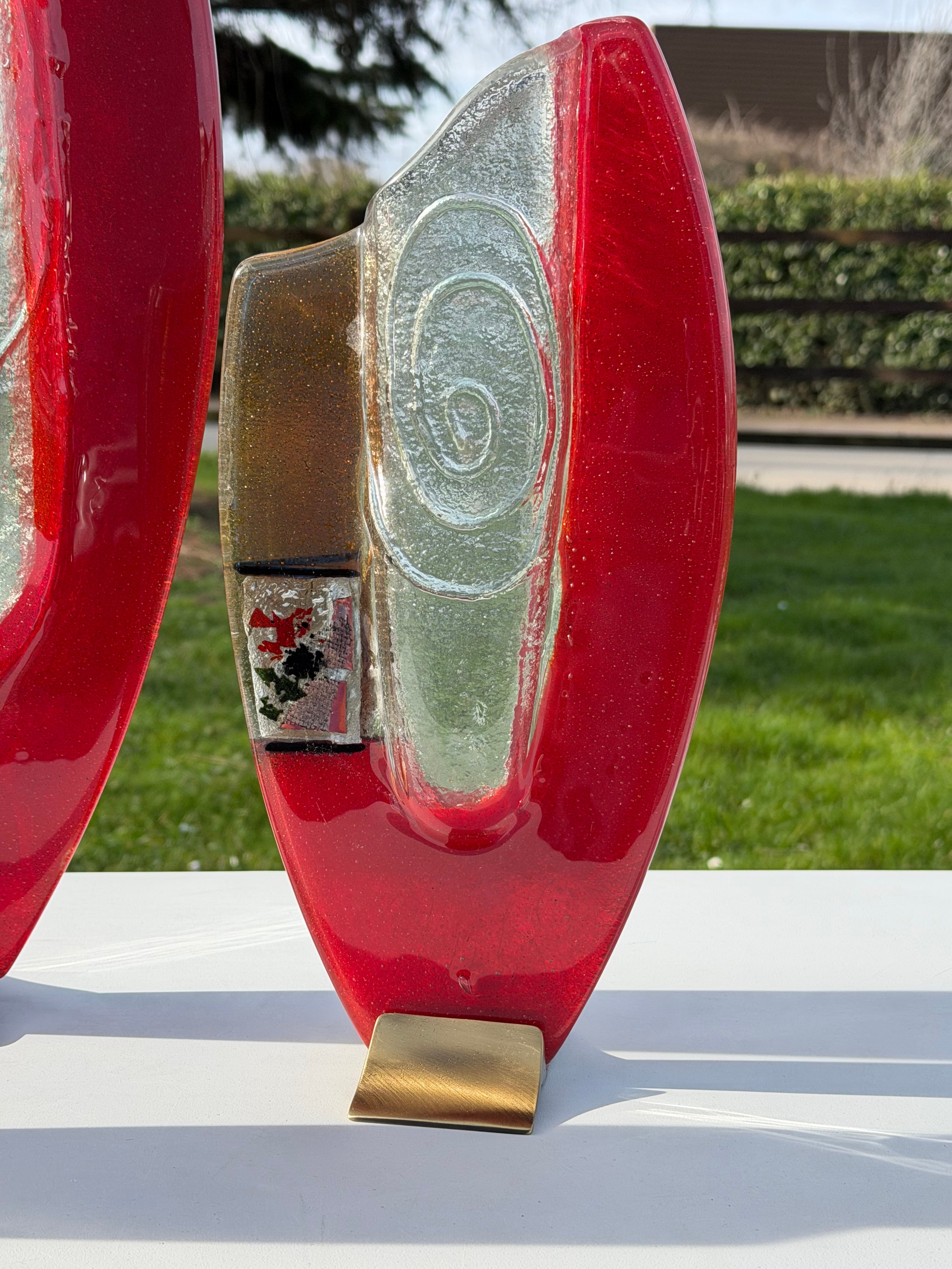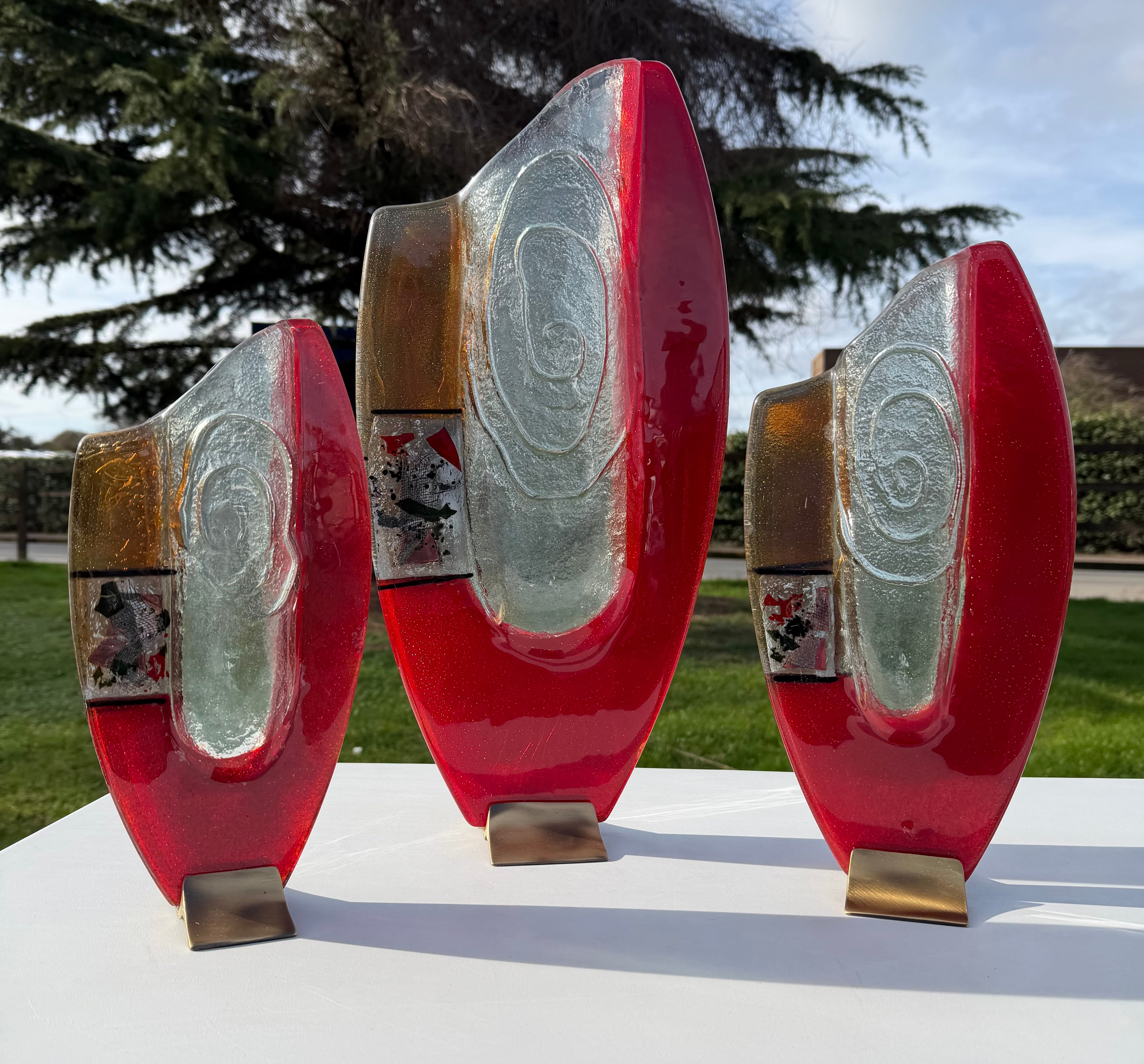 These beautiful vases are part of our Artemis collection. An elegant combination of red, white and pale orange fused glass. The colours are separated by a central transparent piece of glass that brings a dimension of style and glamour to this handcrafted fused glass ornament.