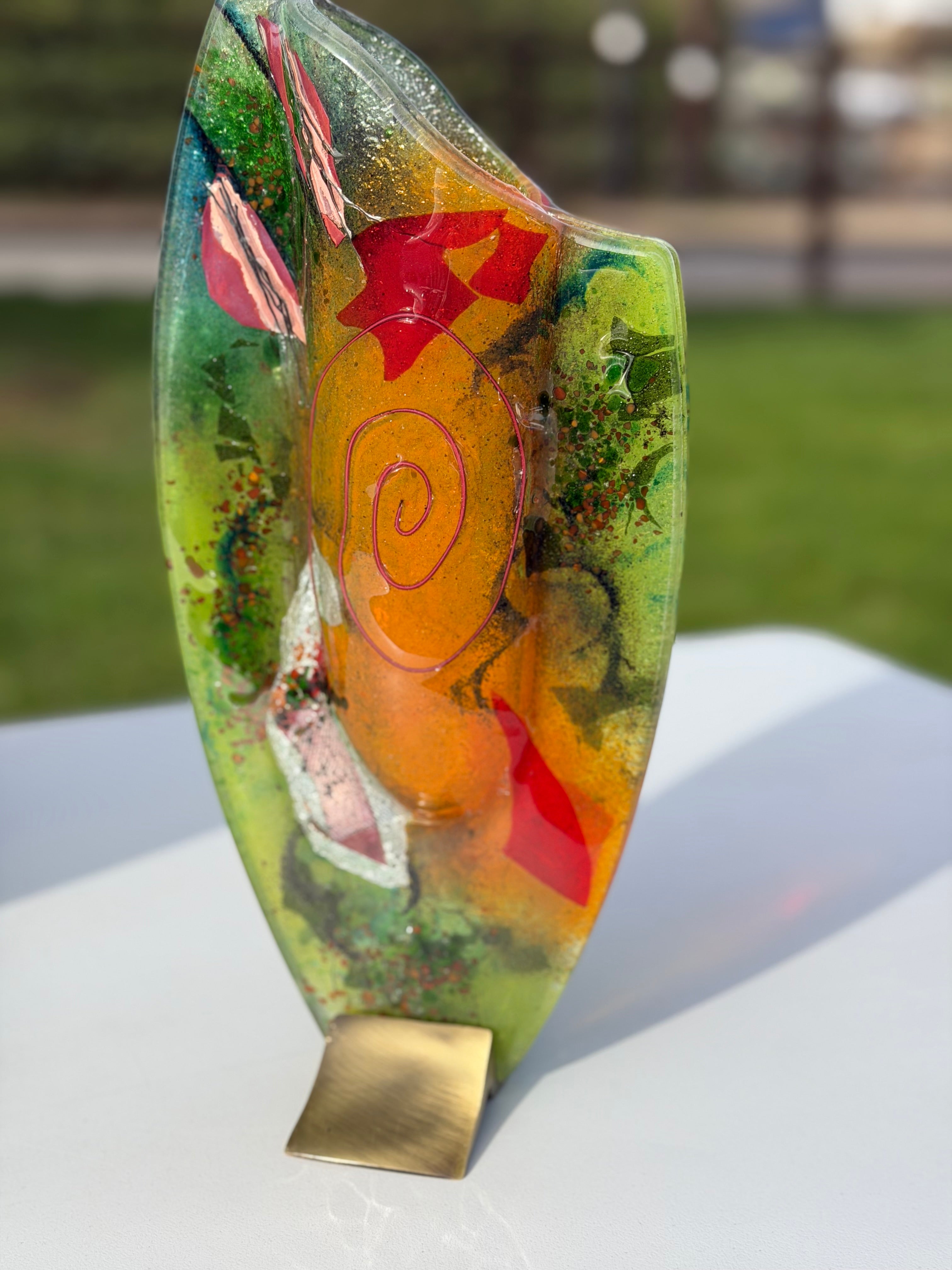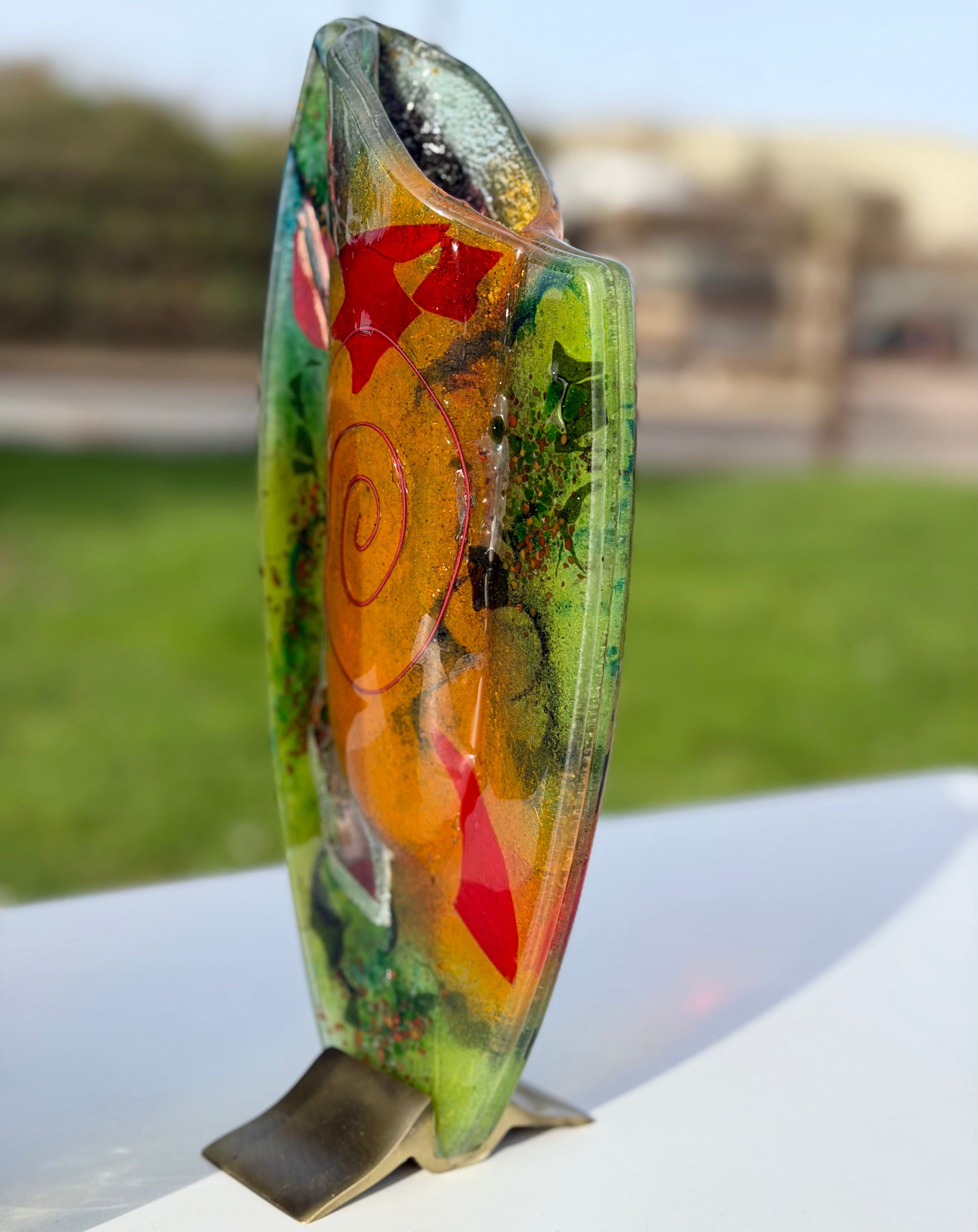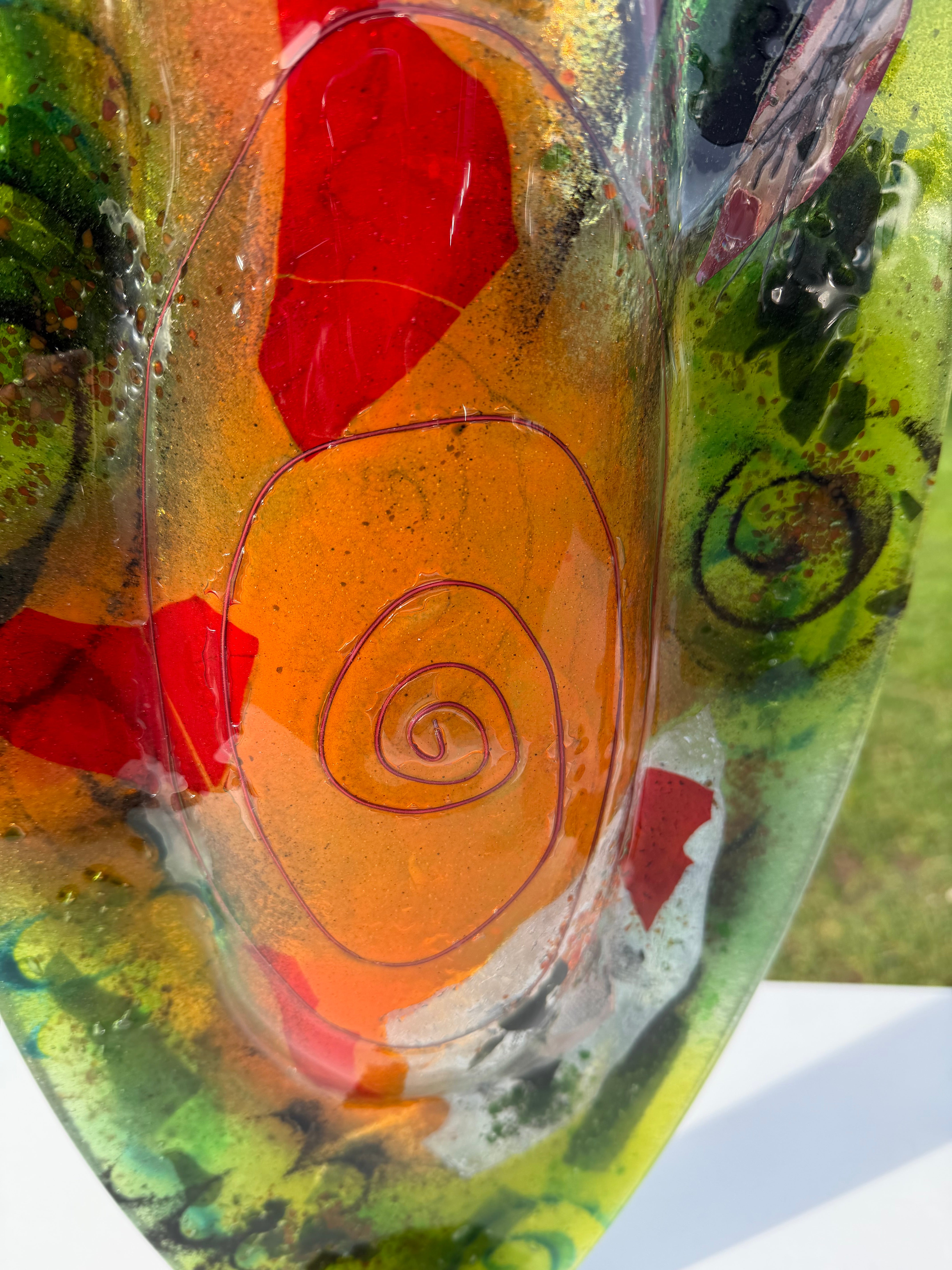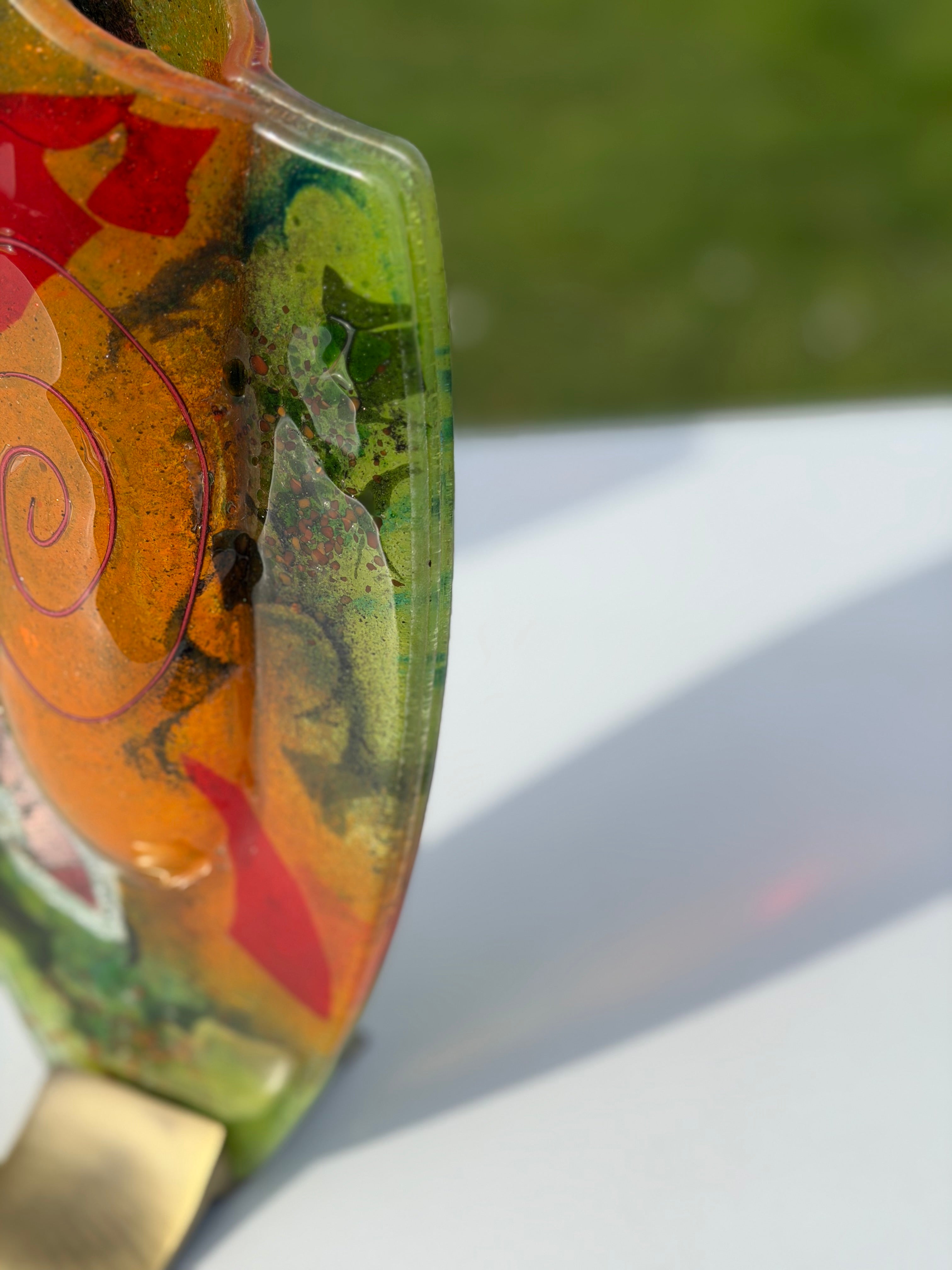 These beautiful vases are part of our Light Green collection. This vase is one of the most vibrantly coloured glass products that we sell.. The striking base colours of vibrant green and orange (along with metallic elements) are complemented with splashes of red, white and blue. All bringing that relaxed and warm summer feeling to your home all year long.