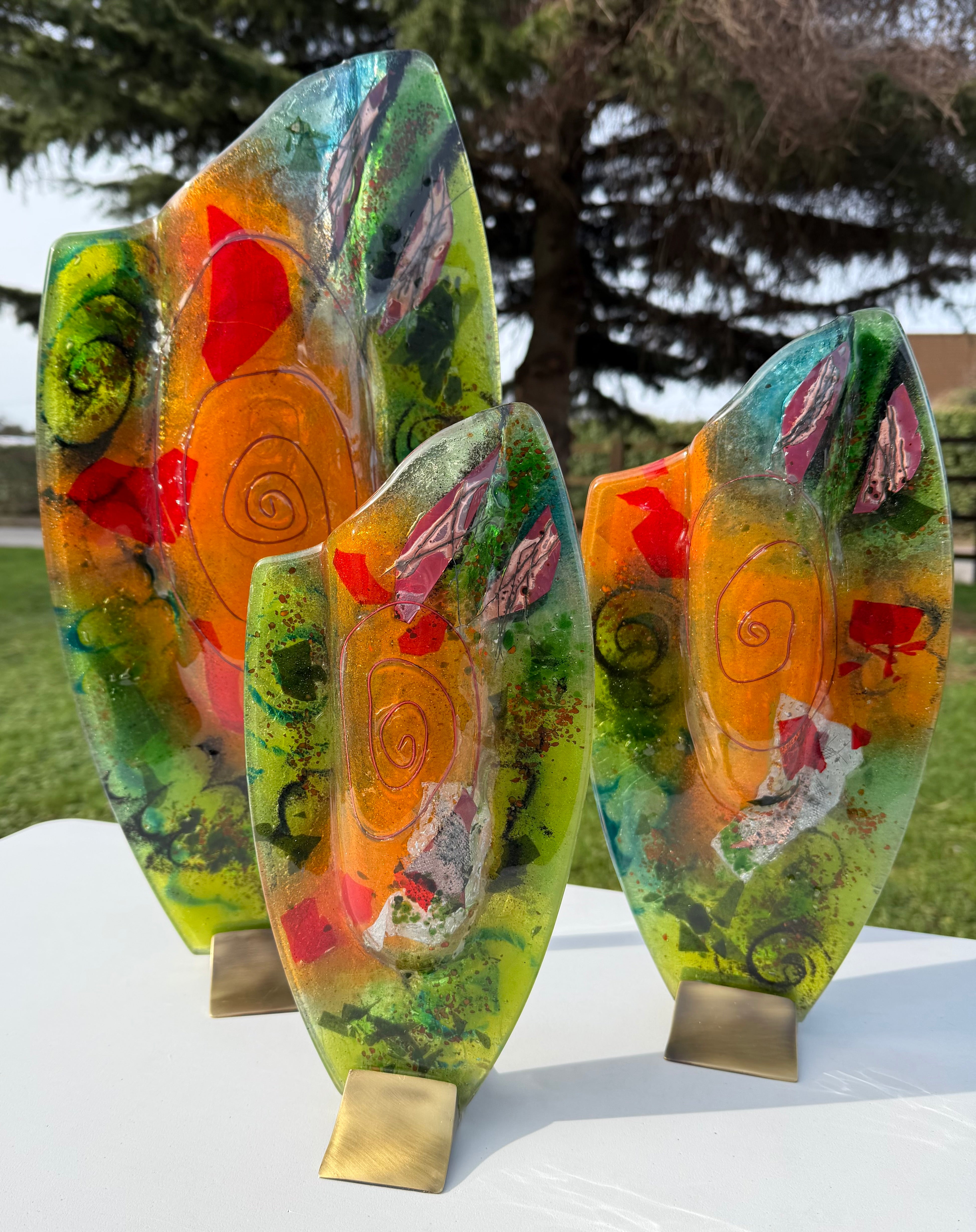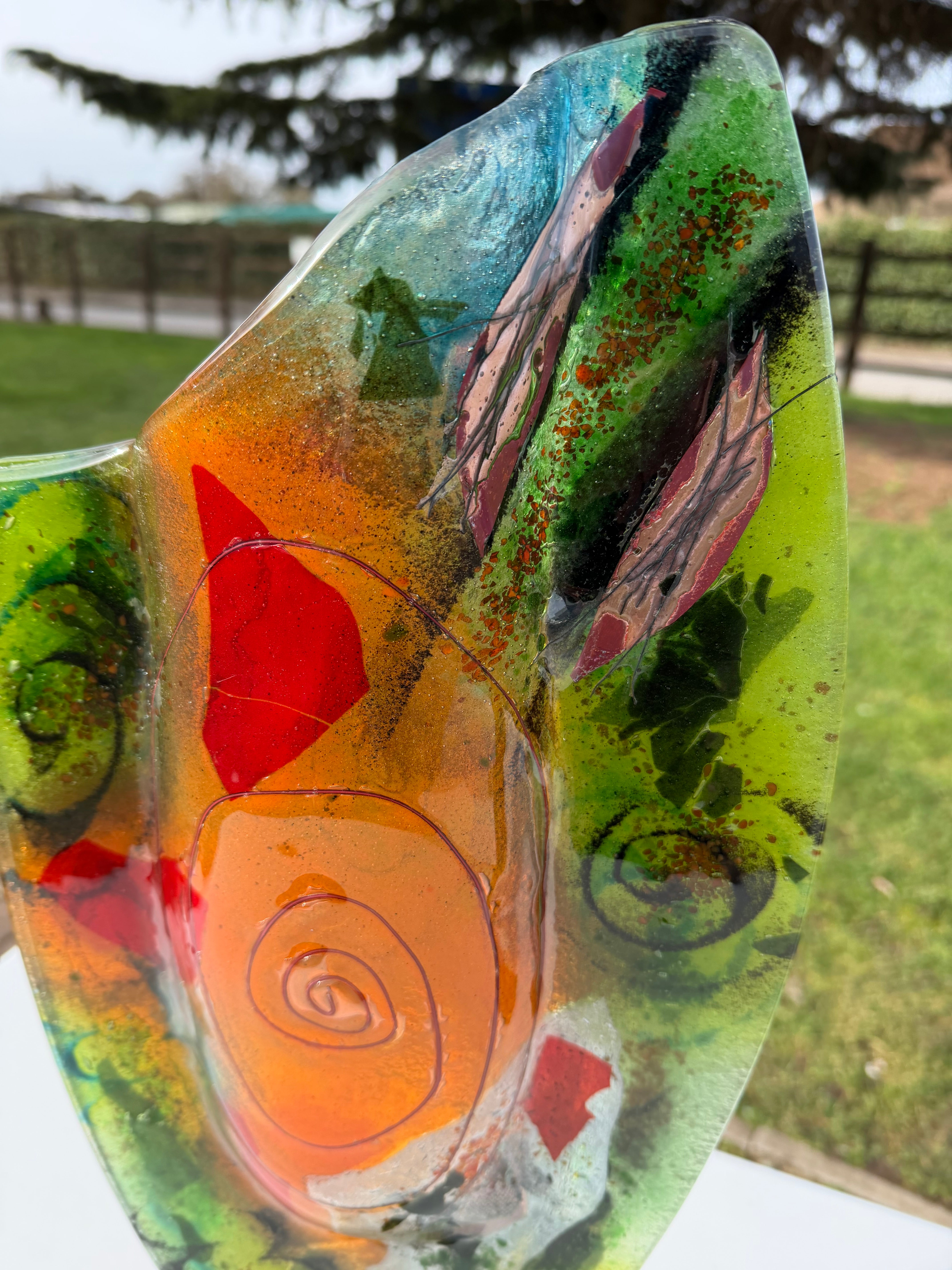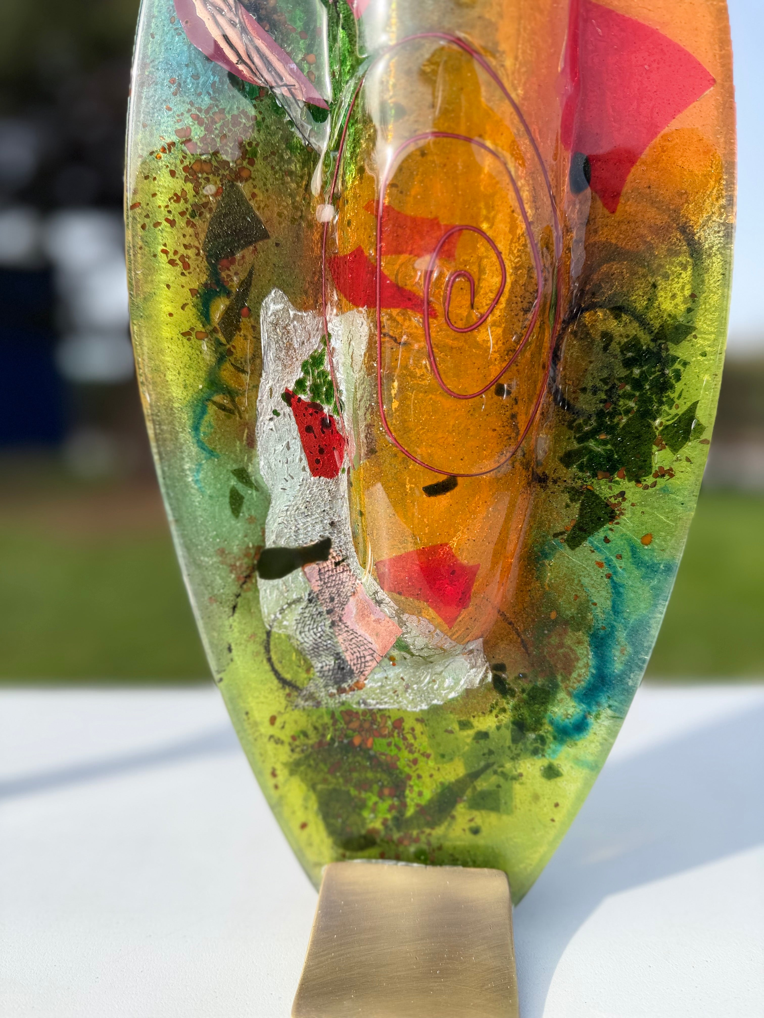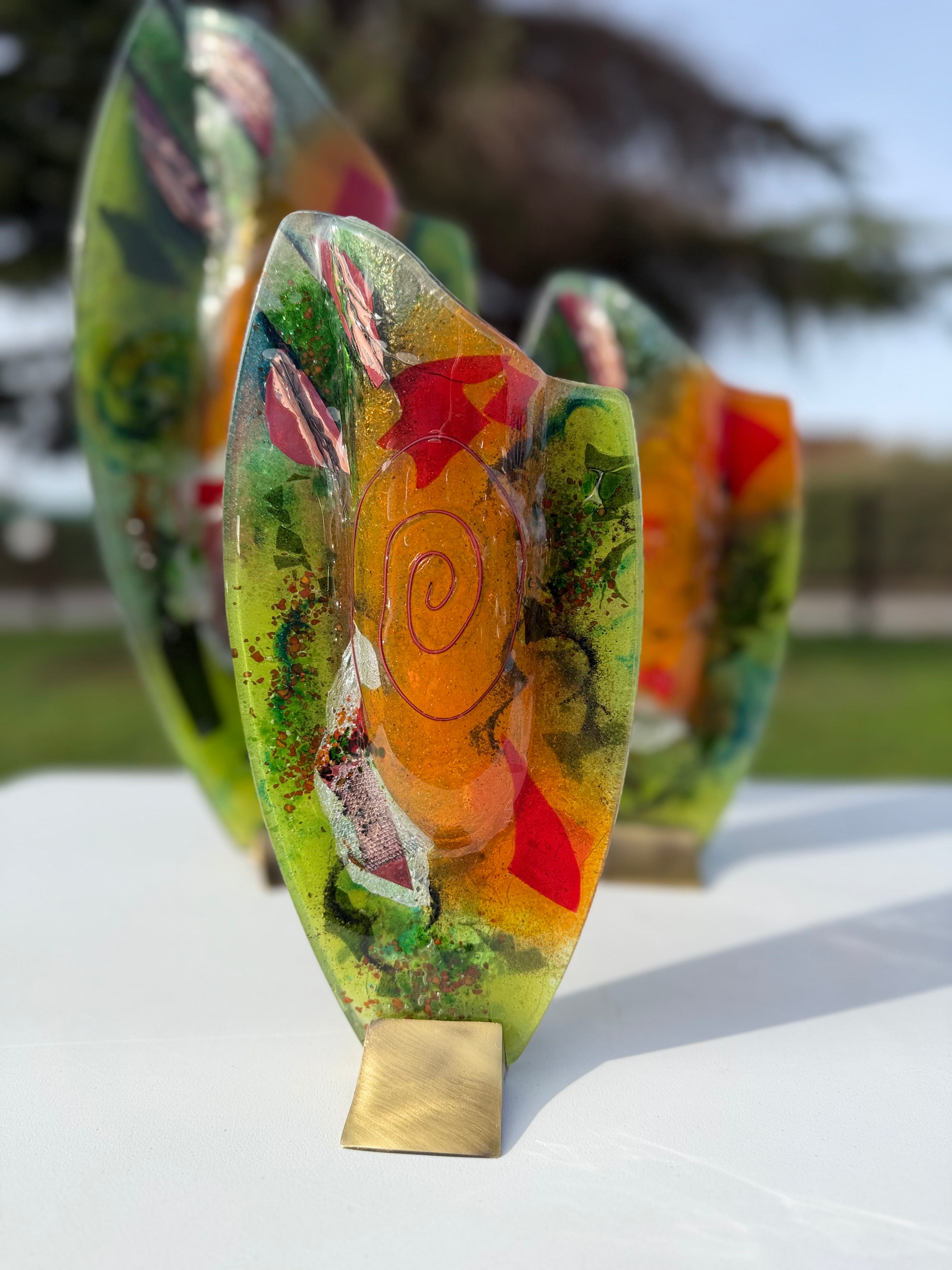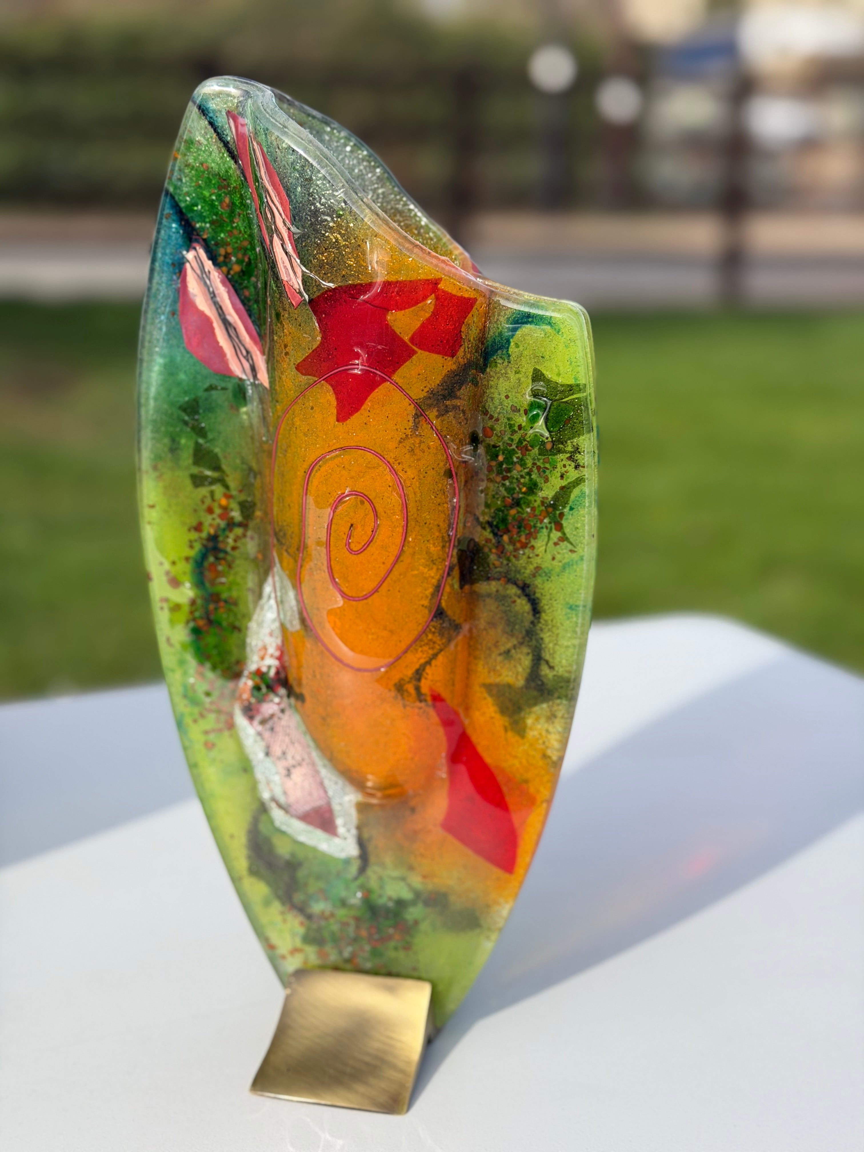These beautiful vases are part of our Light Green collection. This vase is one of the most vibrantly coloured glass products that we sell.. The striking base colours of vibrant green and orange (along with metallic elements) are complemented with splashes of red, white and blue. All bringing that relaxed and warm summer feeling to your home all year long.