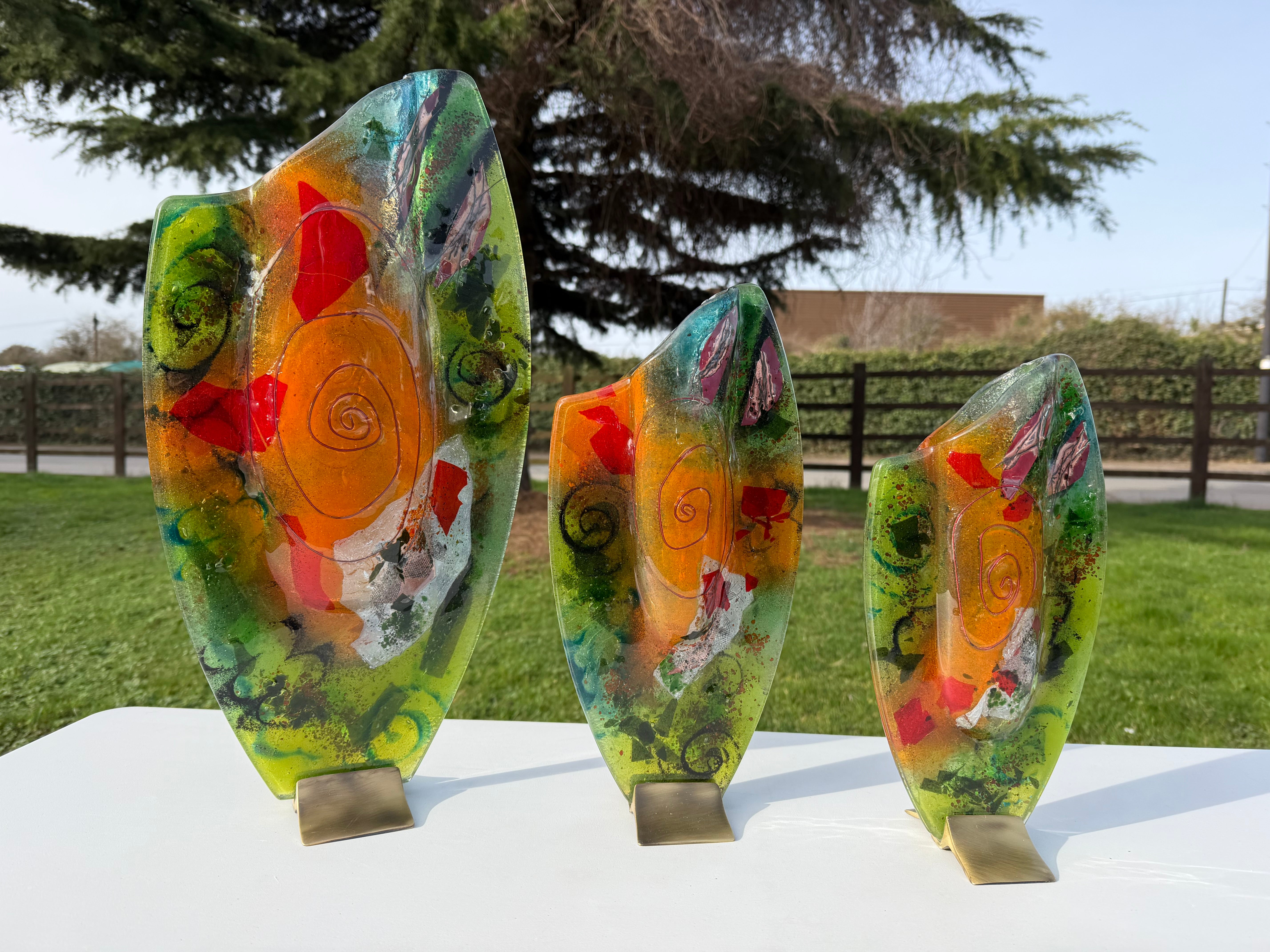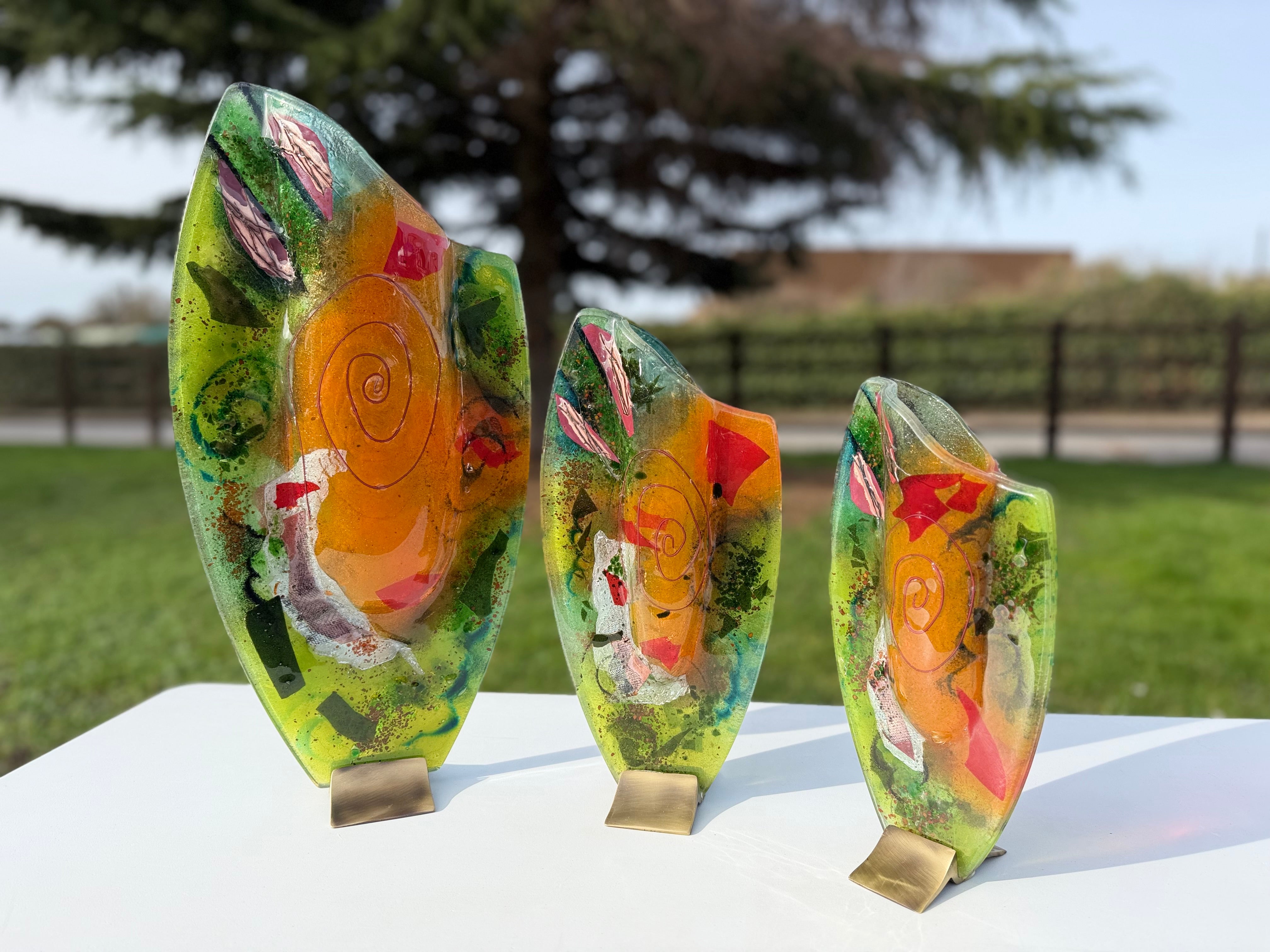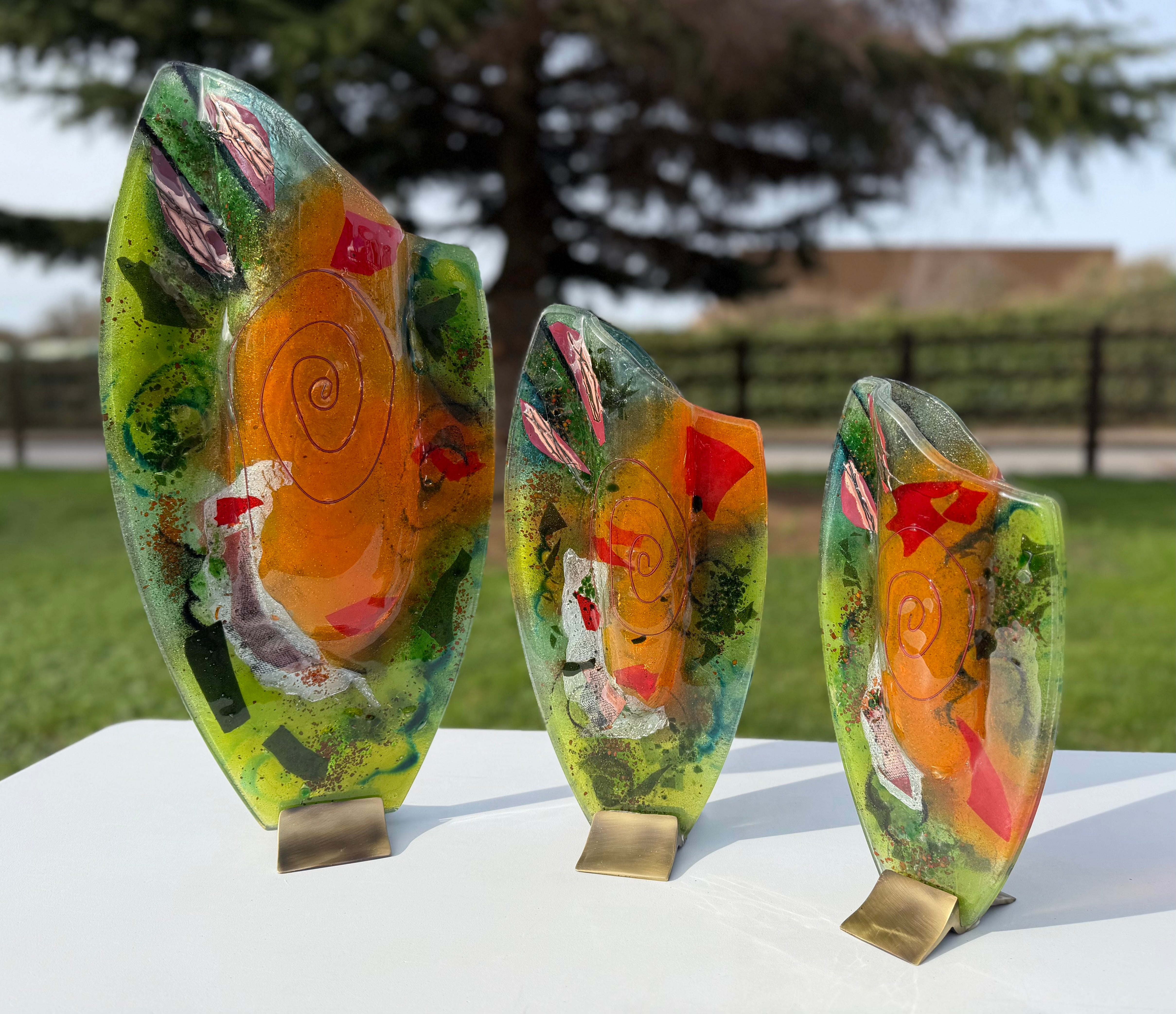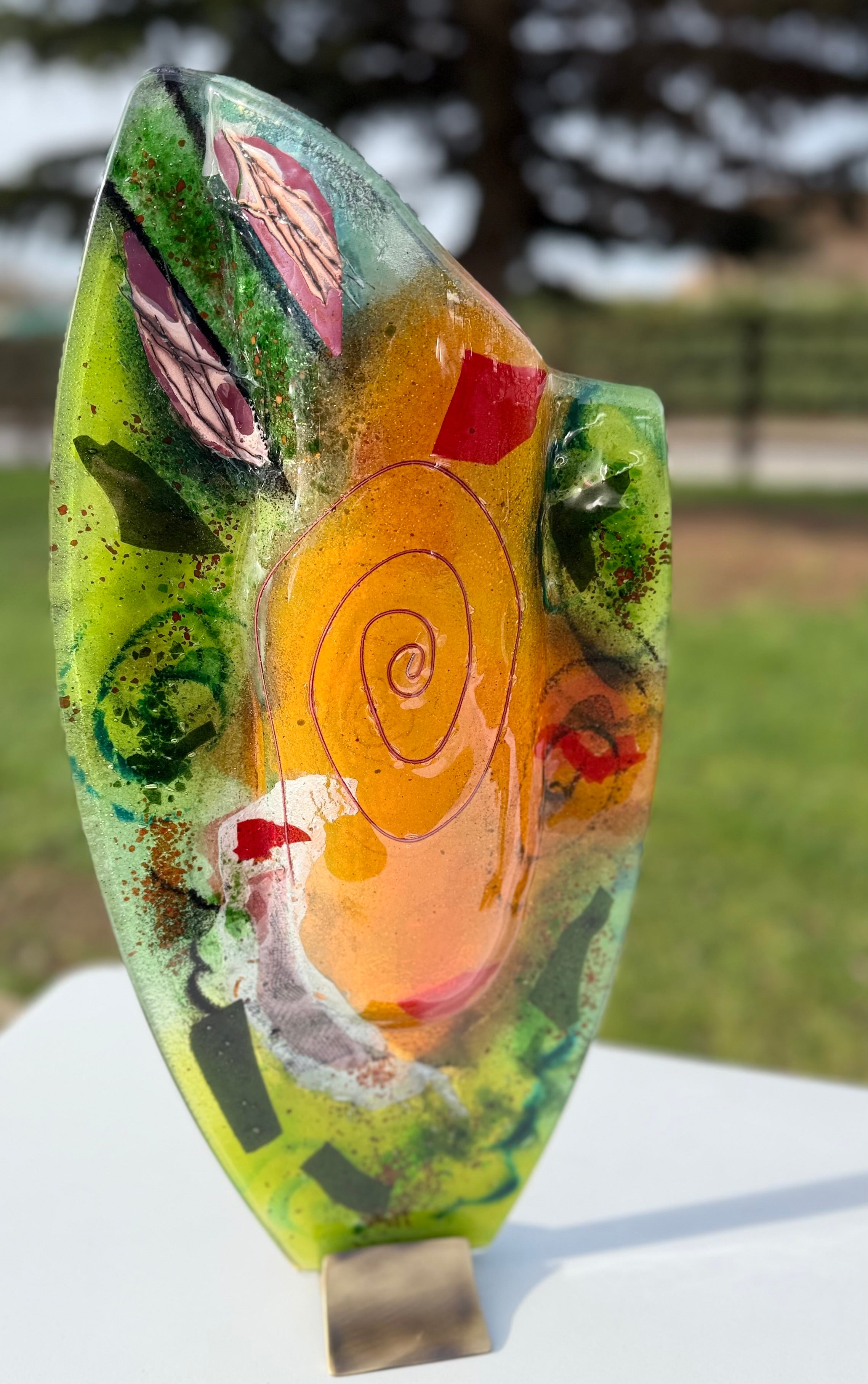These beautiful vases are part of our Light Green collection. This vase is one of the most vibrantly coloured glass products that we sell.. The striking base colours of vibrant green and orange (along with metallic elements) are complemented with splashes of red, white and blue. All bringing that relaxed and warm summer feeling to your home all year long.
