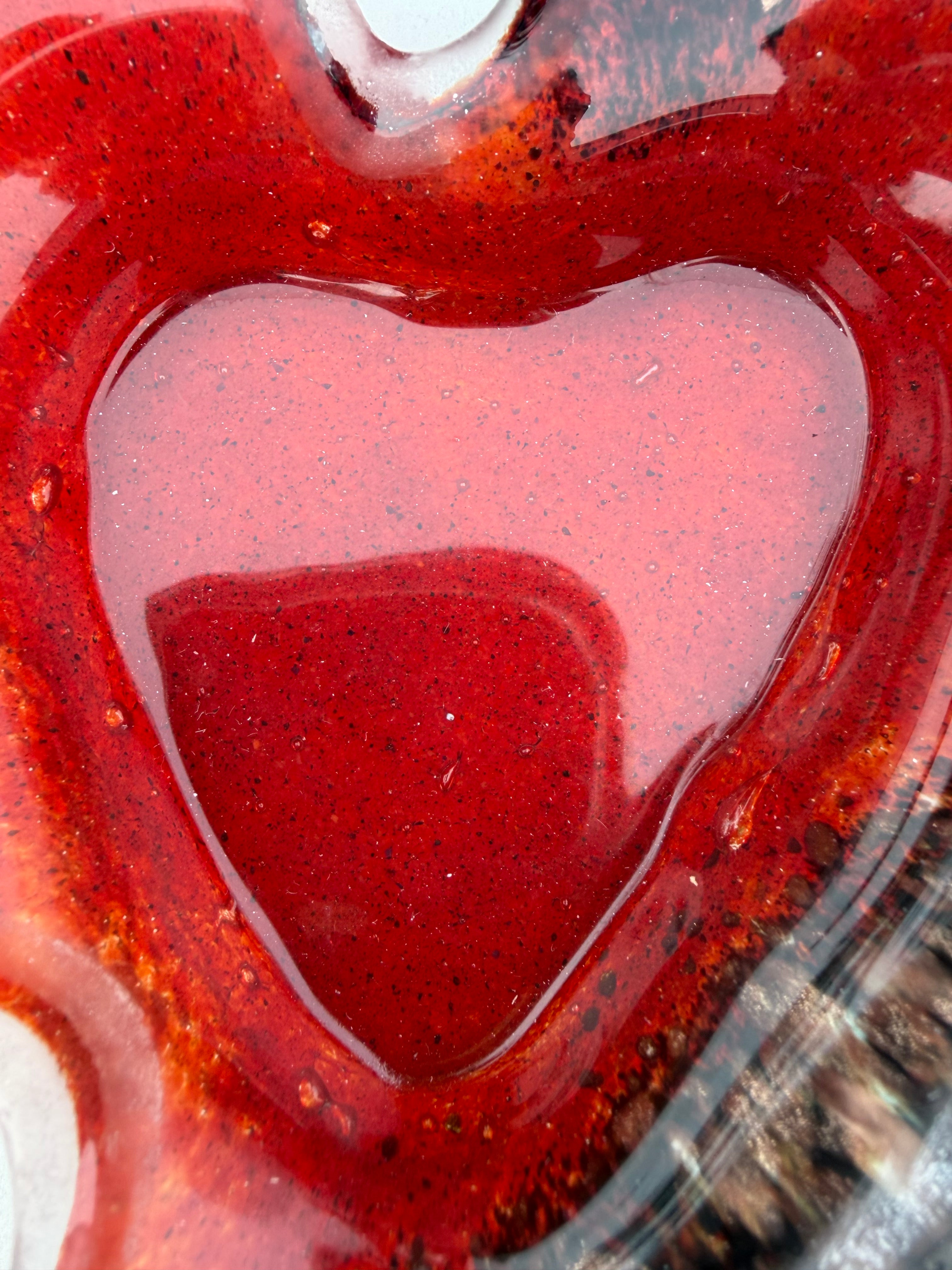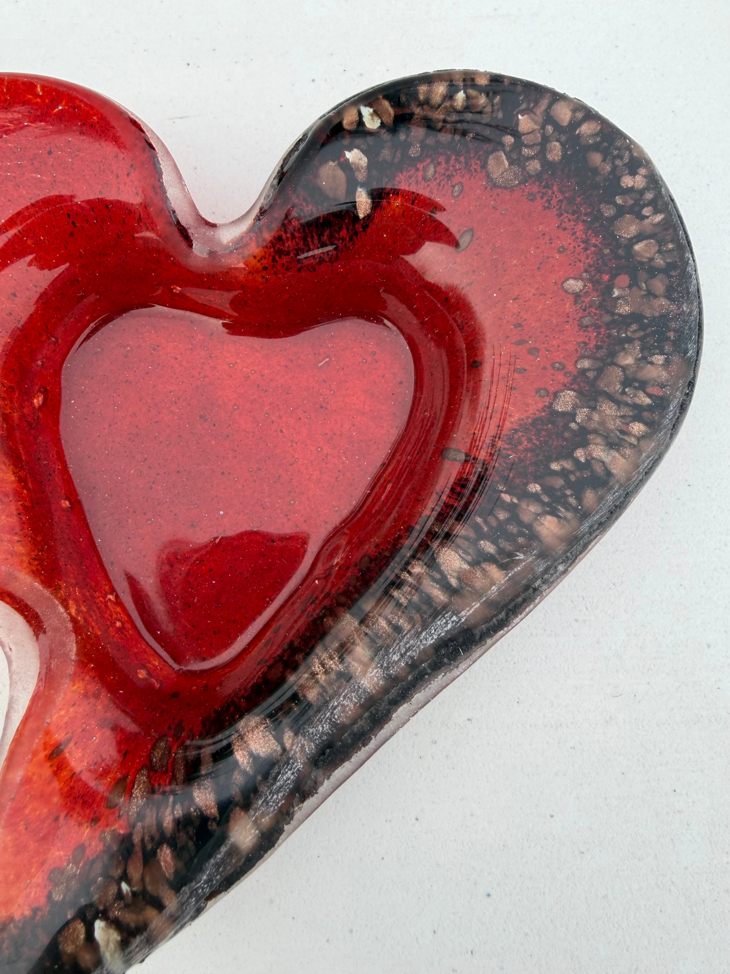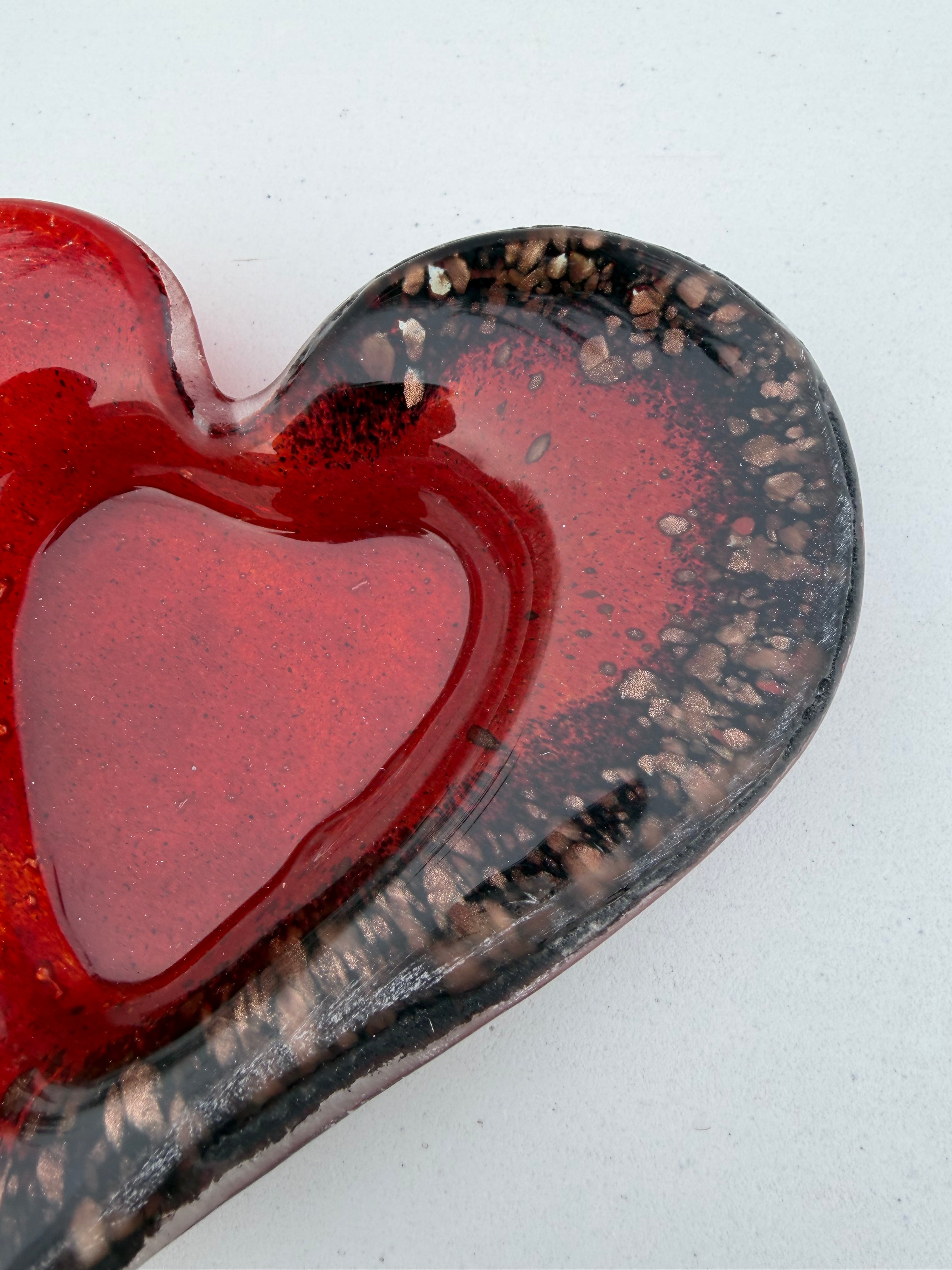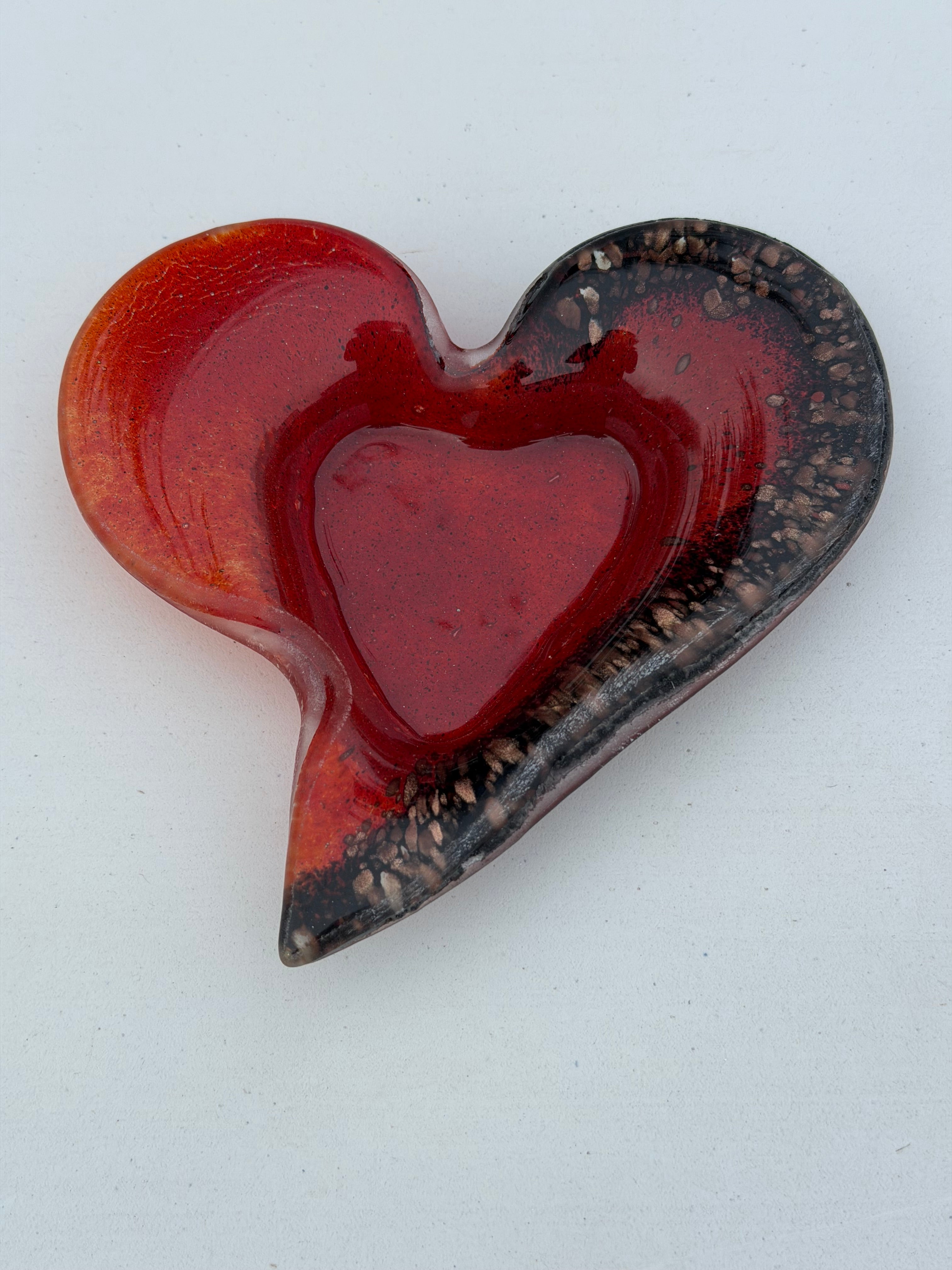 This is the Fedra Red colour scheme. This beautiful fused glass ornament is coloured in a rustic mix of red and orange, along with black glass, adorned with golden/copper metallic flakes.