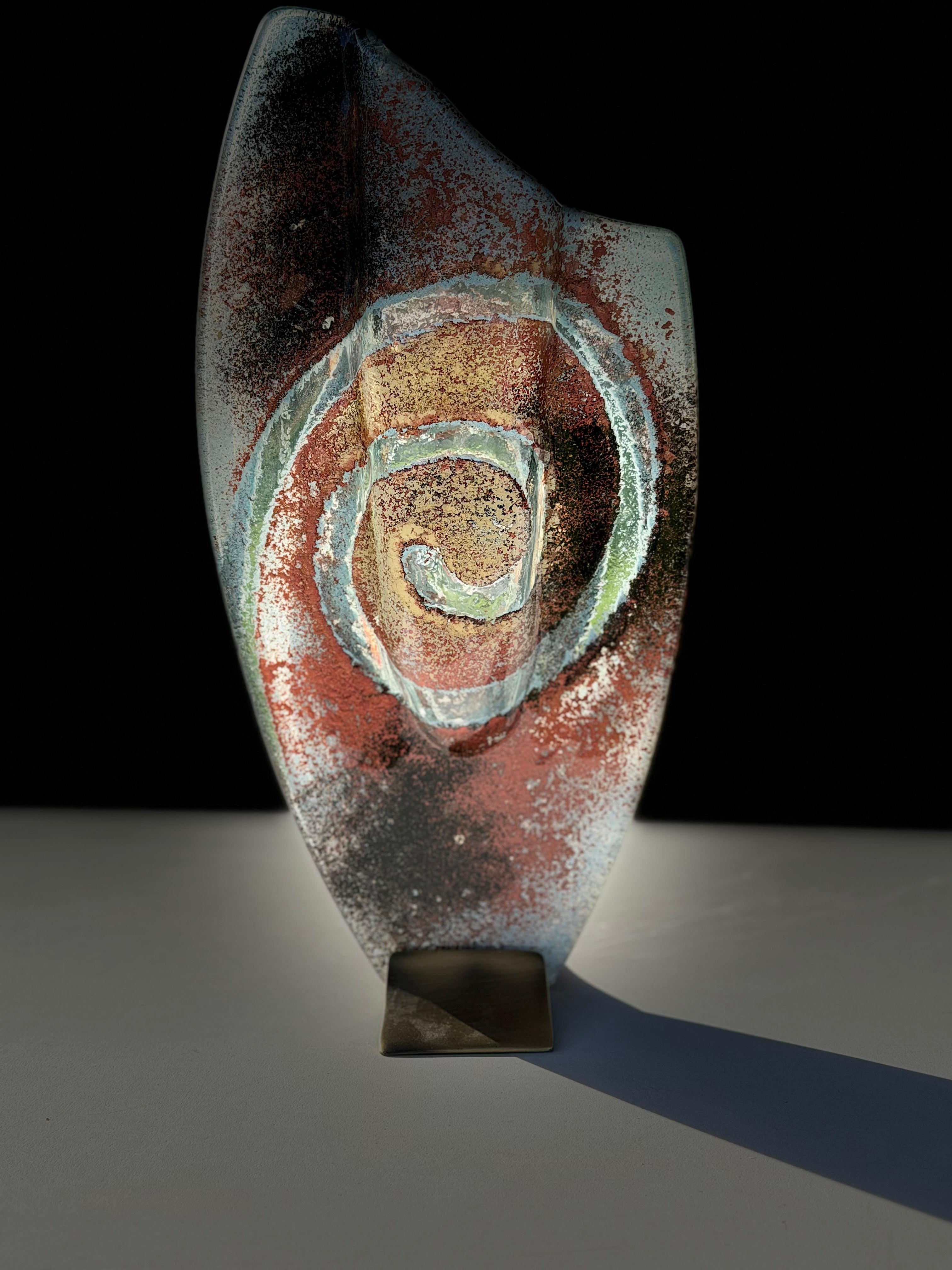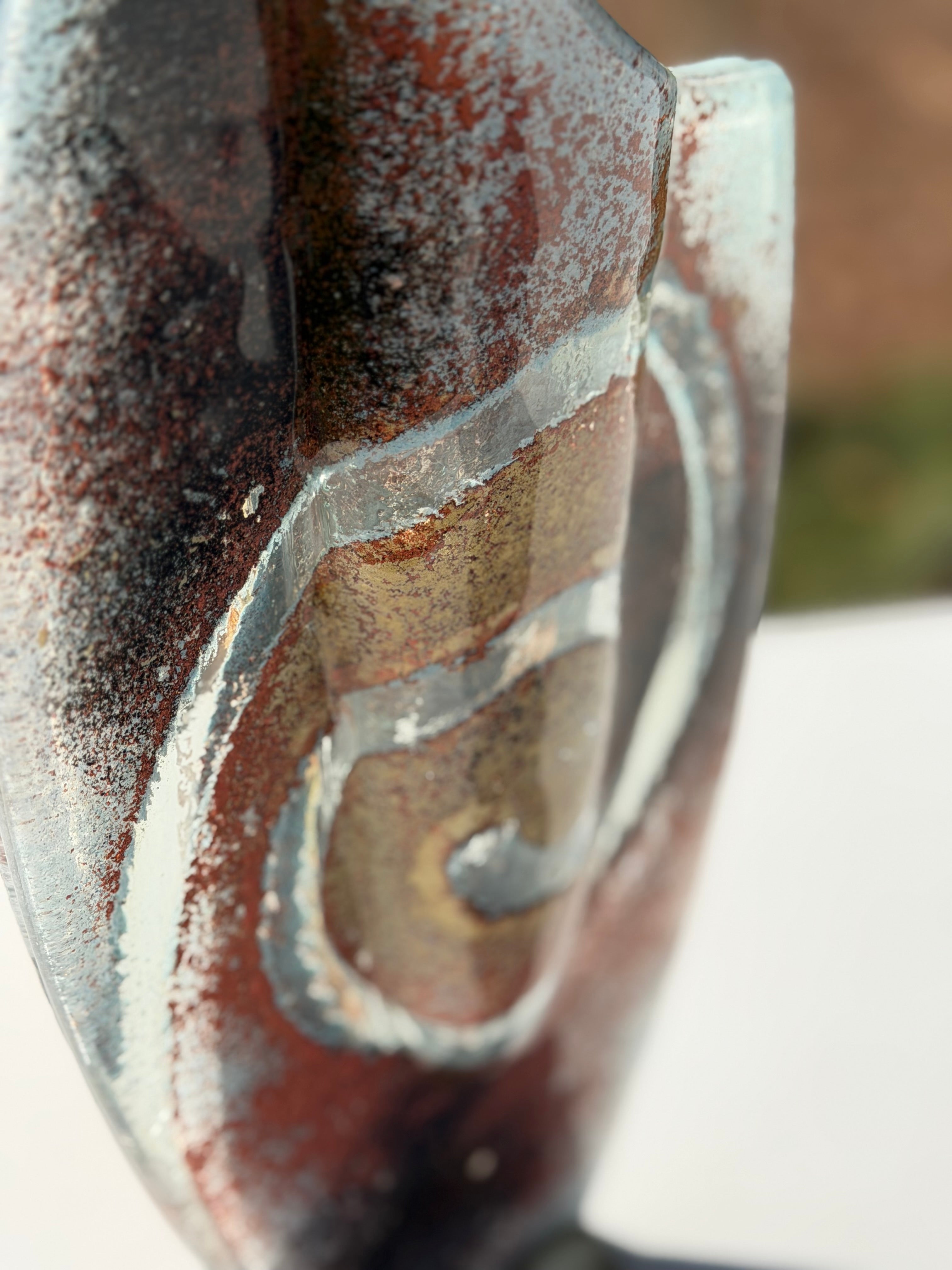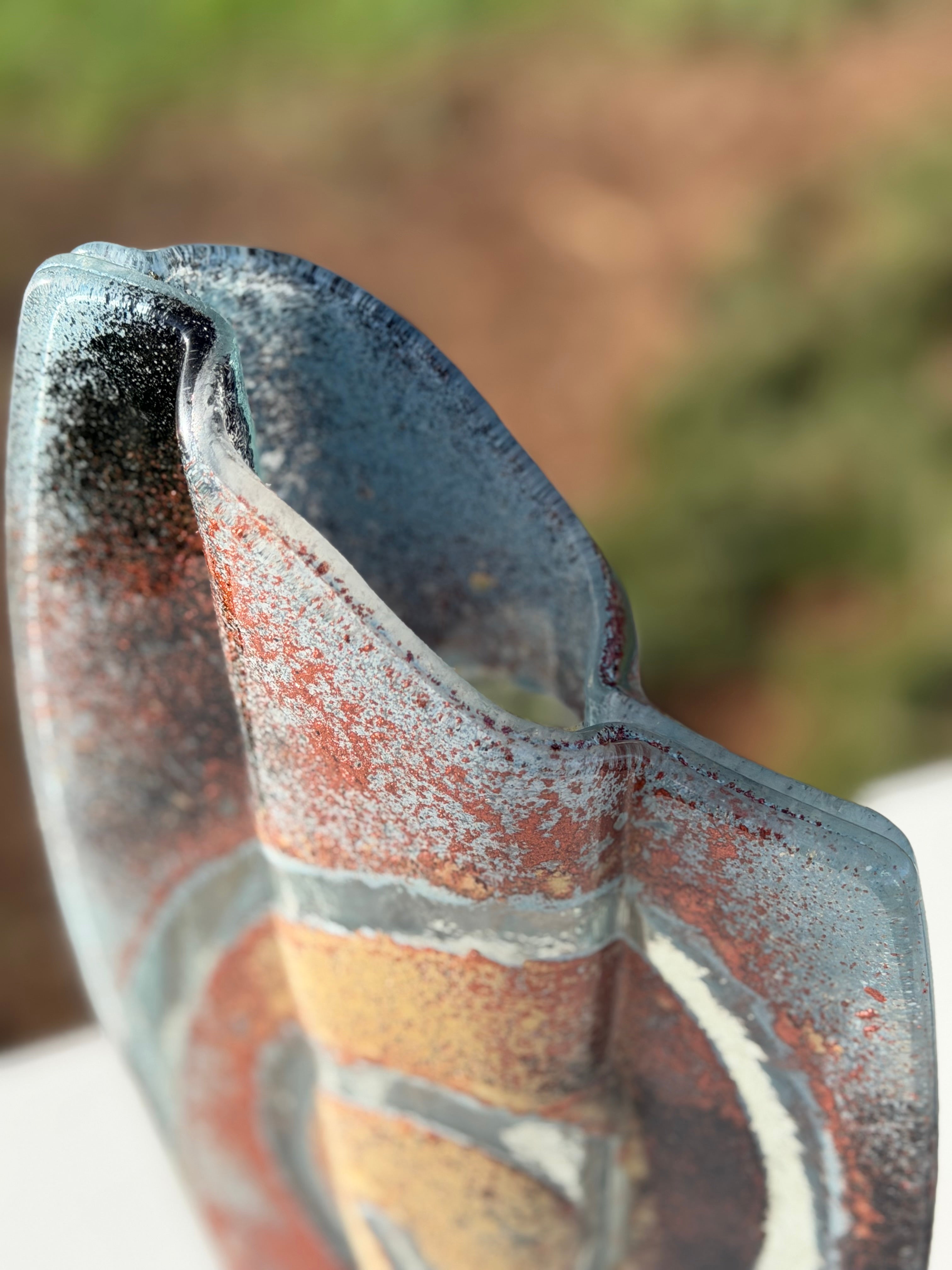 This vase is handcrafted by Eratini Artistic Glass studio in Greece. They are world renowned for their striking use of colour and the unique artistic vision behind the fused glassware they produce.