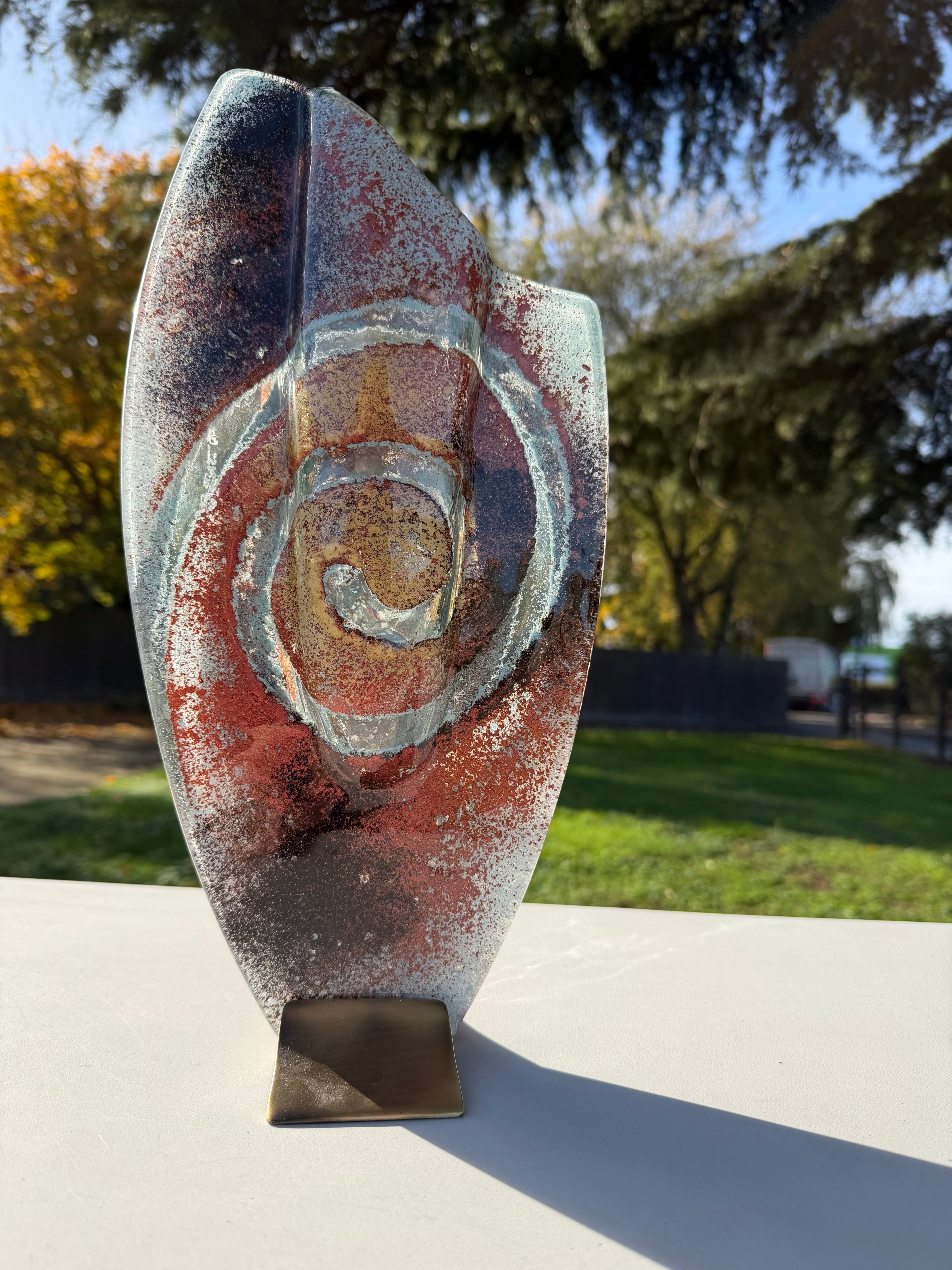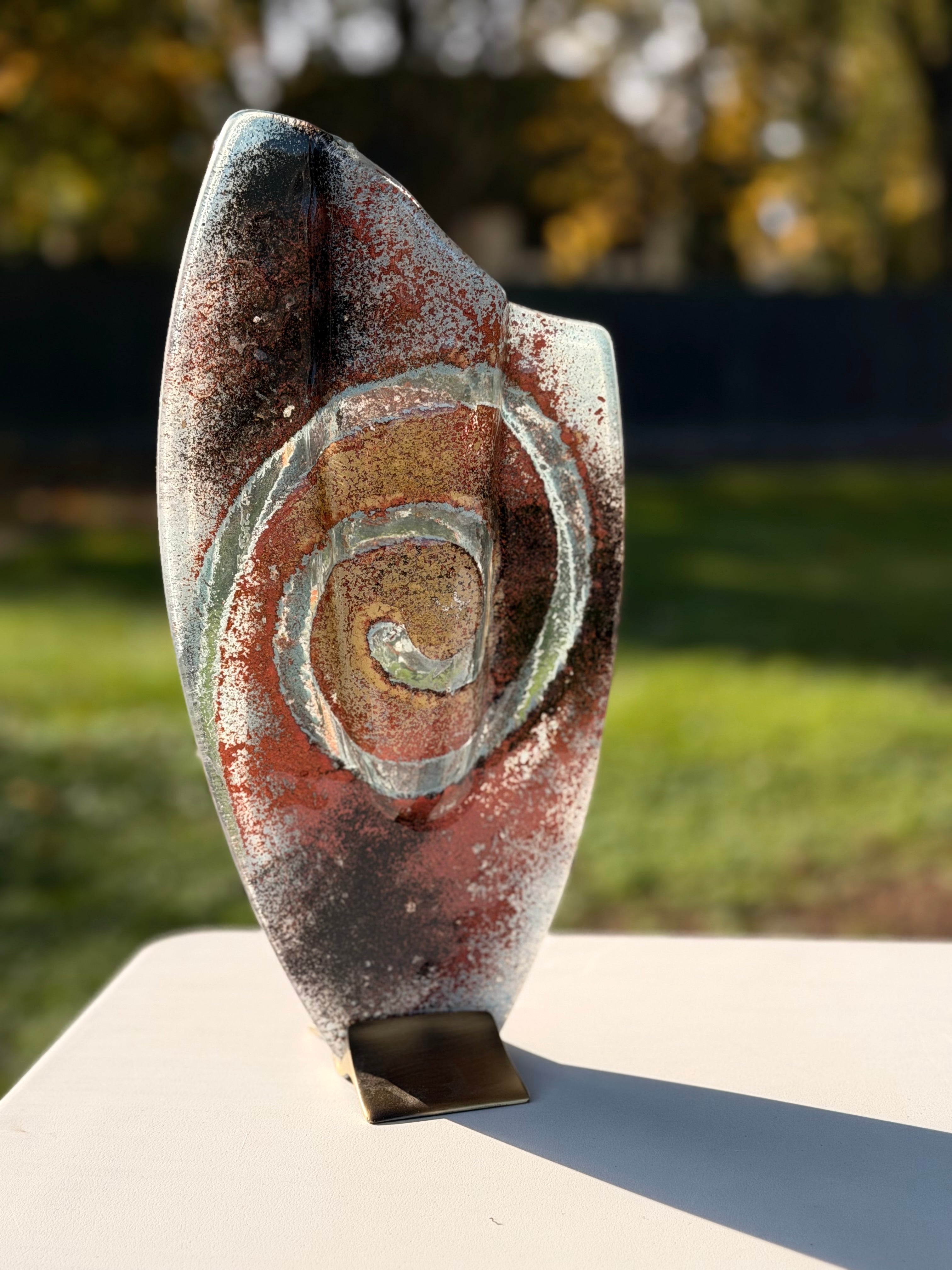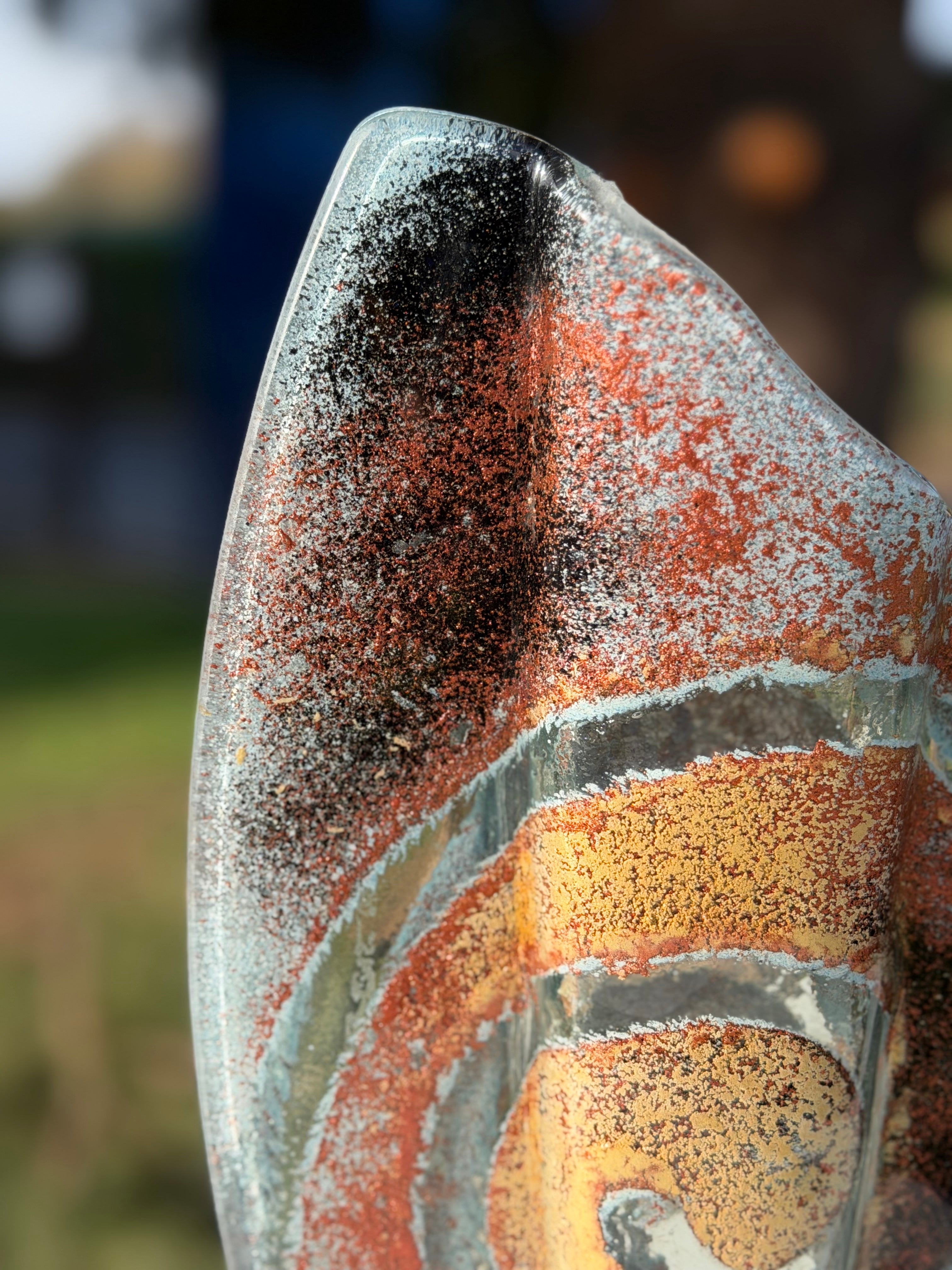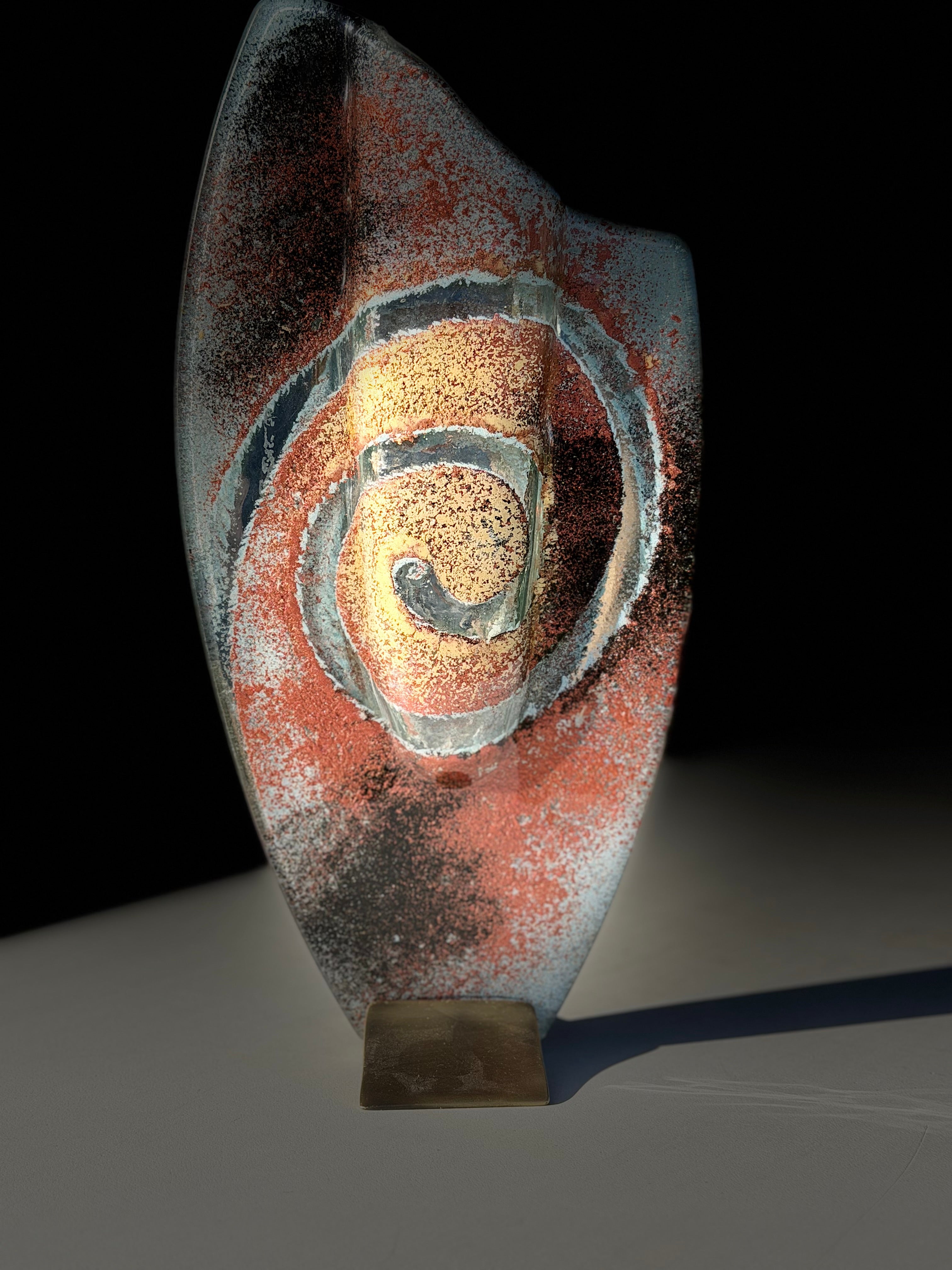 This vase is handcrafted by Eratini Artistic Glass studio in Greece. They are world renowned for their striking use of colour and the unique artistic vision behind the fused glassware they produce.