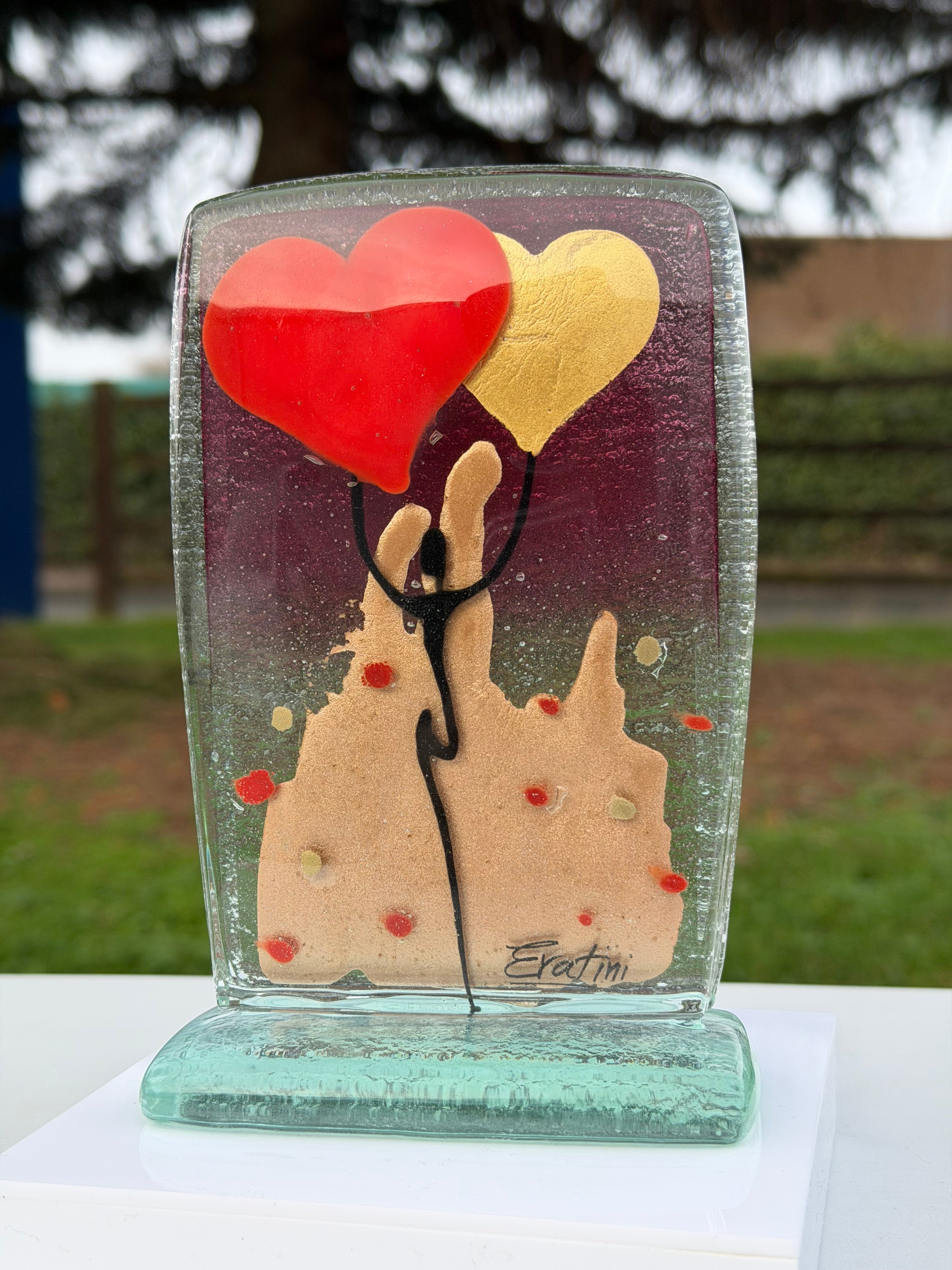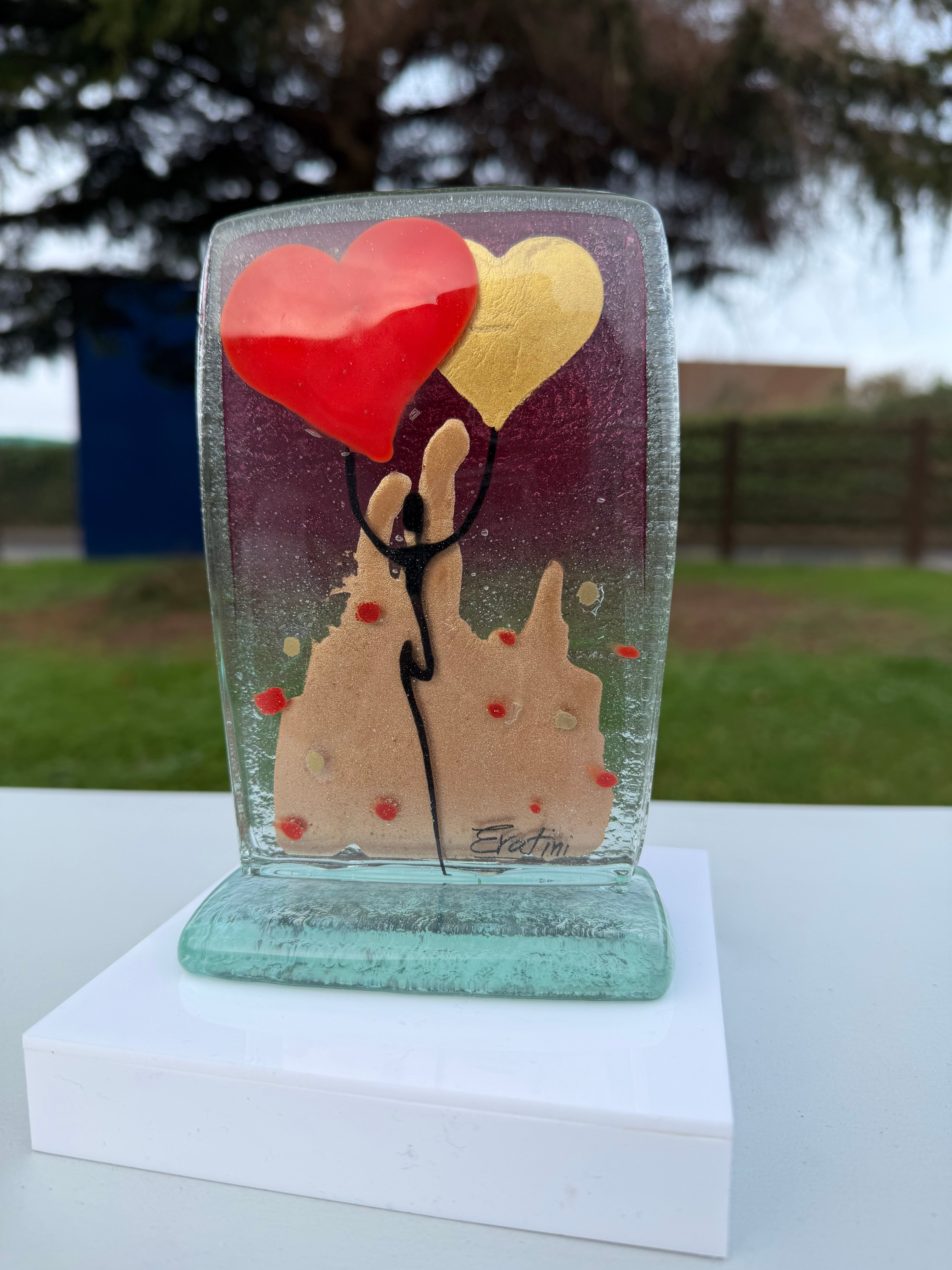 The vibrant Balloon Hearts design is applied on multiple layers of glass, which are then is fused together giving a 3 dimensional effect. This depth intensifies the way that light is magnified through the glass and emphasises the beautiful colours and metallic elements used to create this artistic glass collectible.
