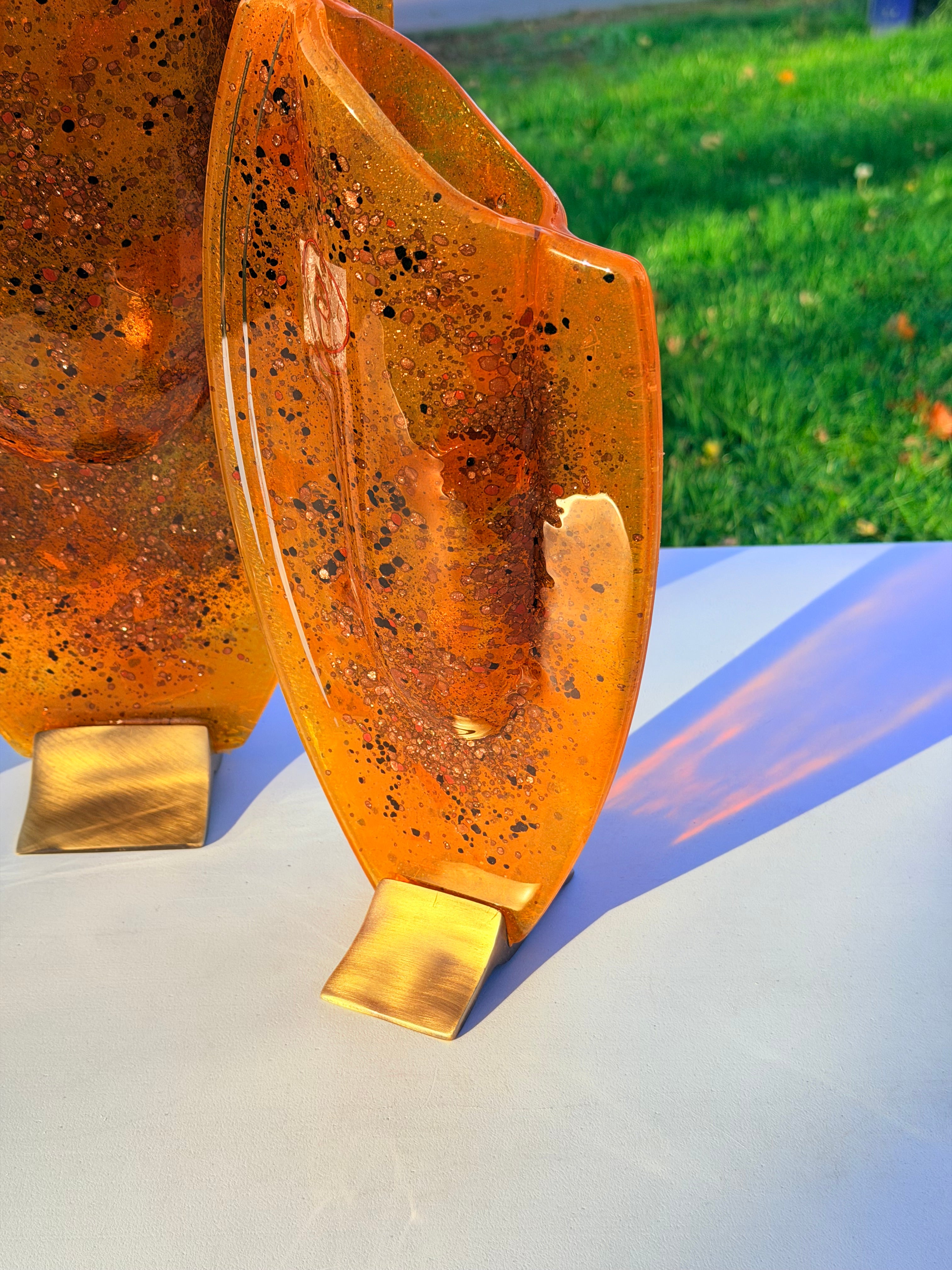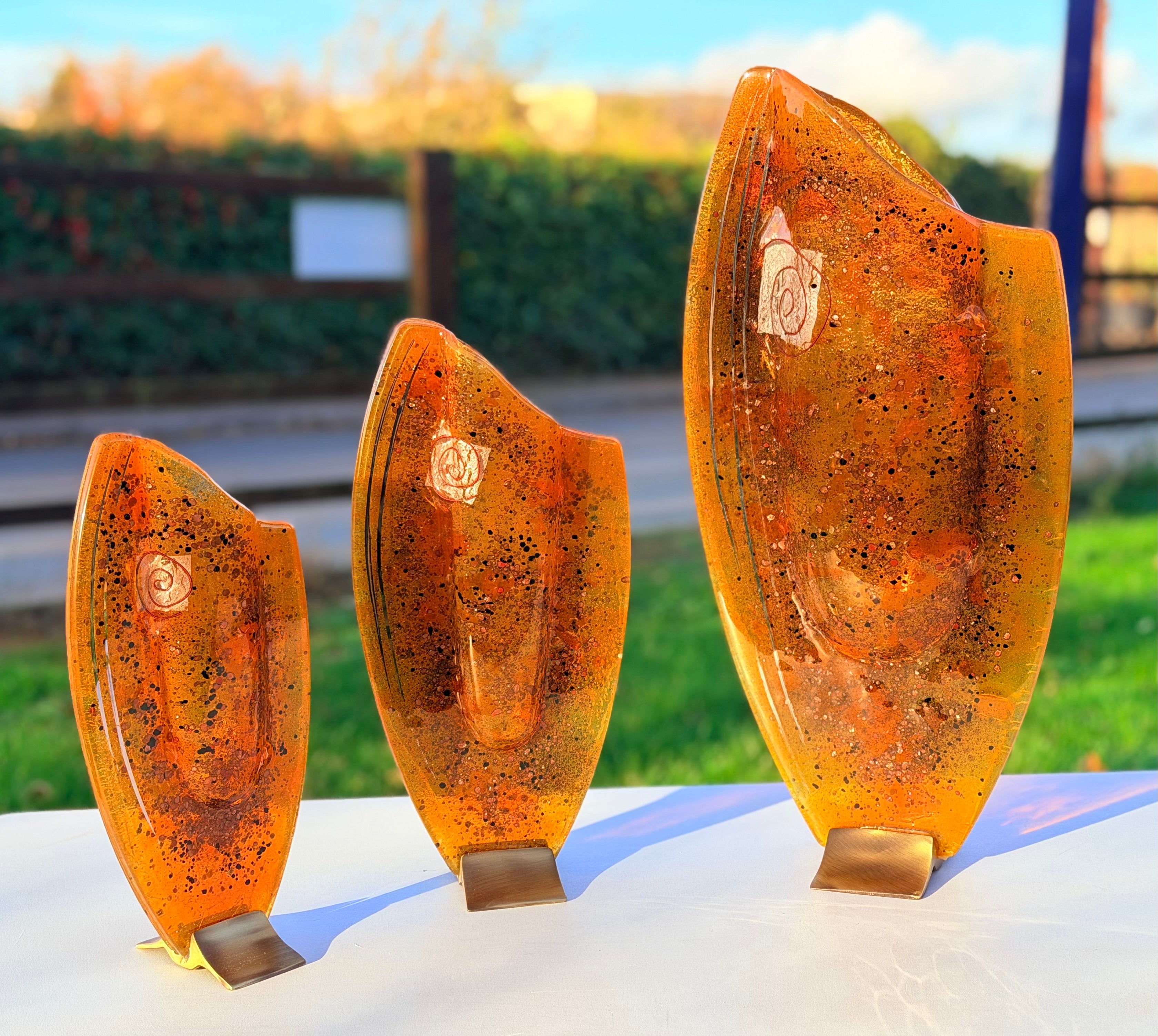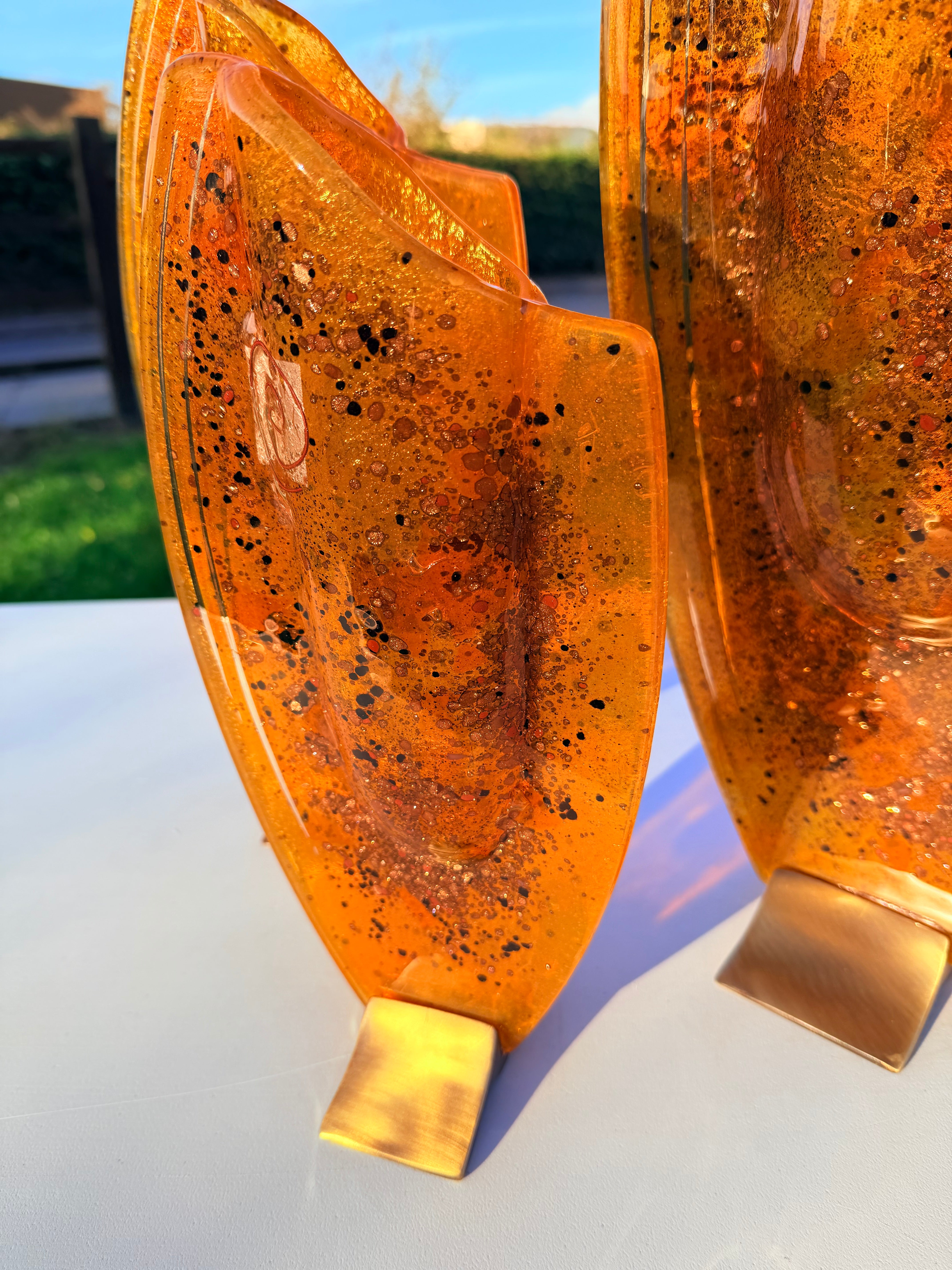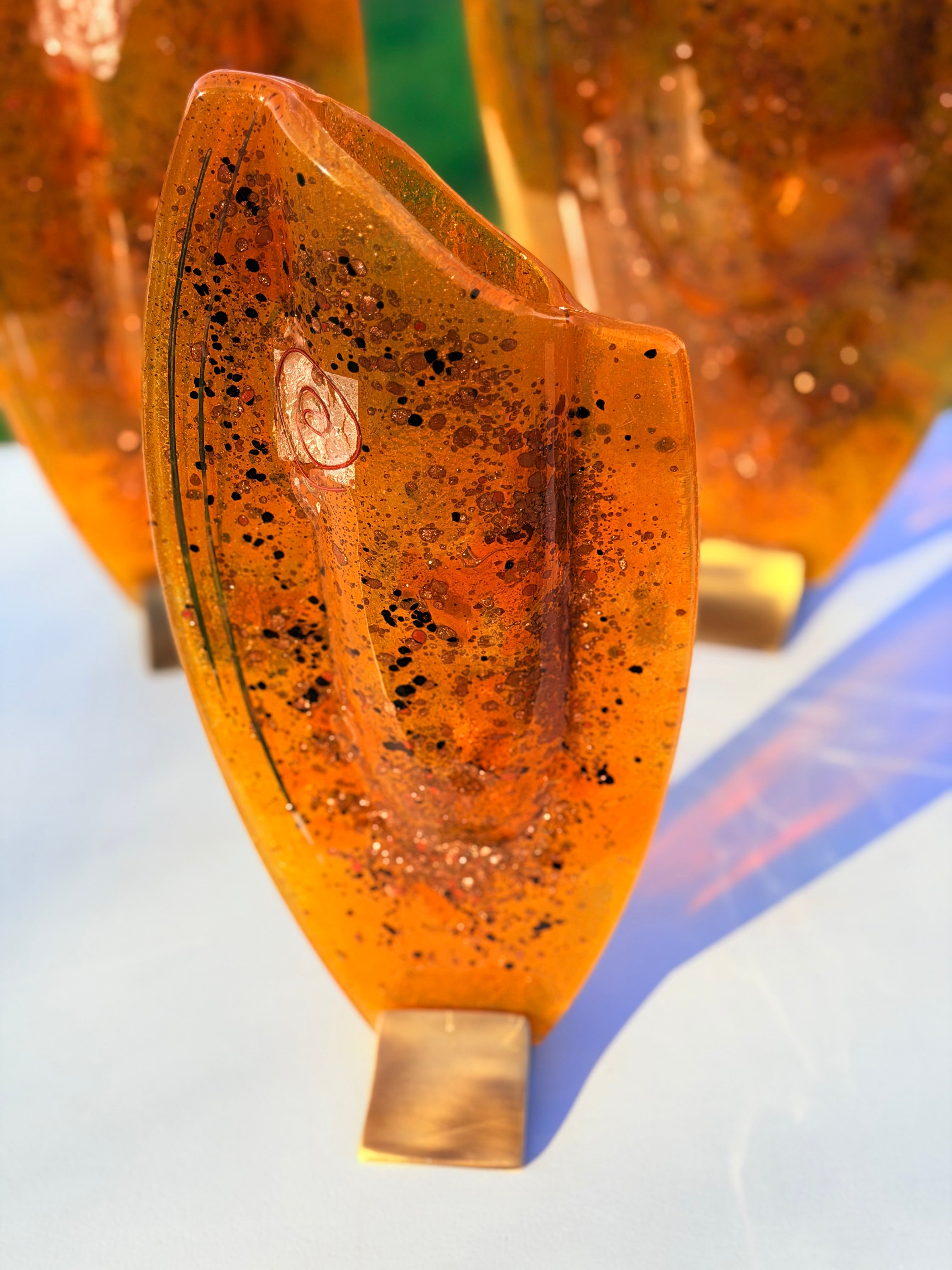 These beautiful vases are part of our Satsuma collection. A warm orange with speckles of platinum & copper throughout. The perfect piece to add some warmth to your home.