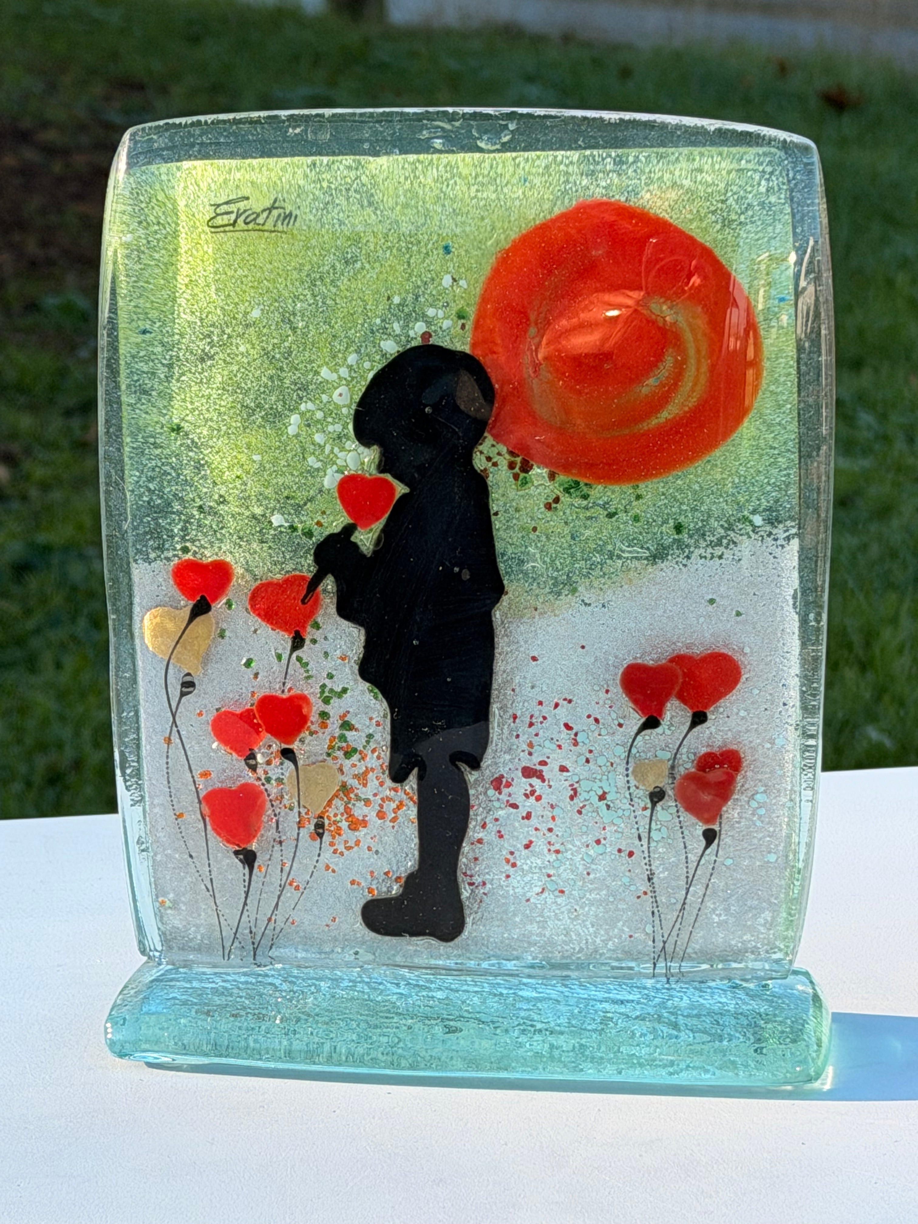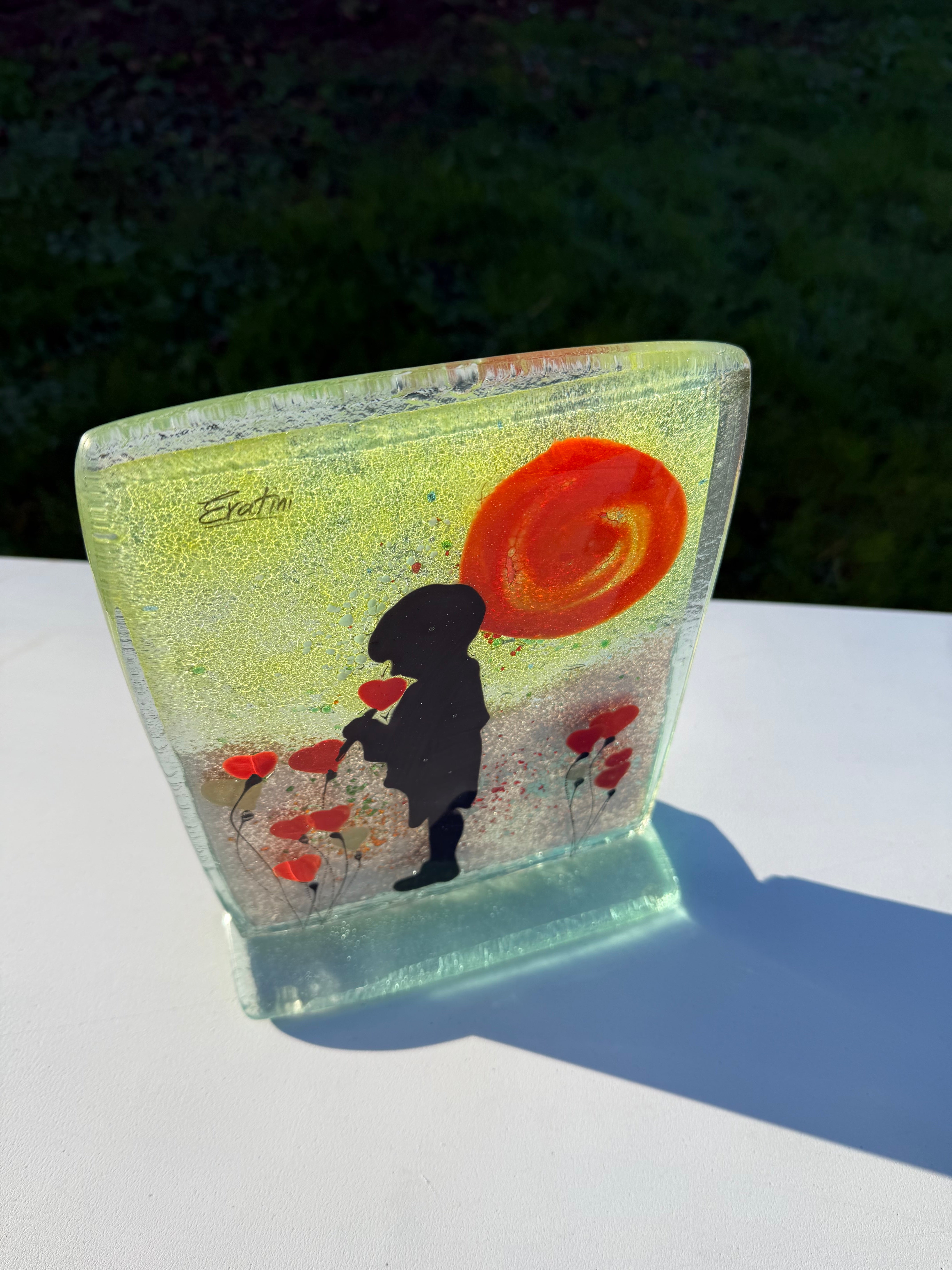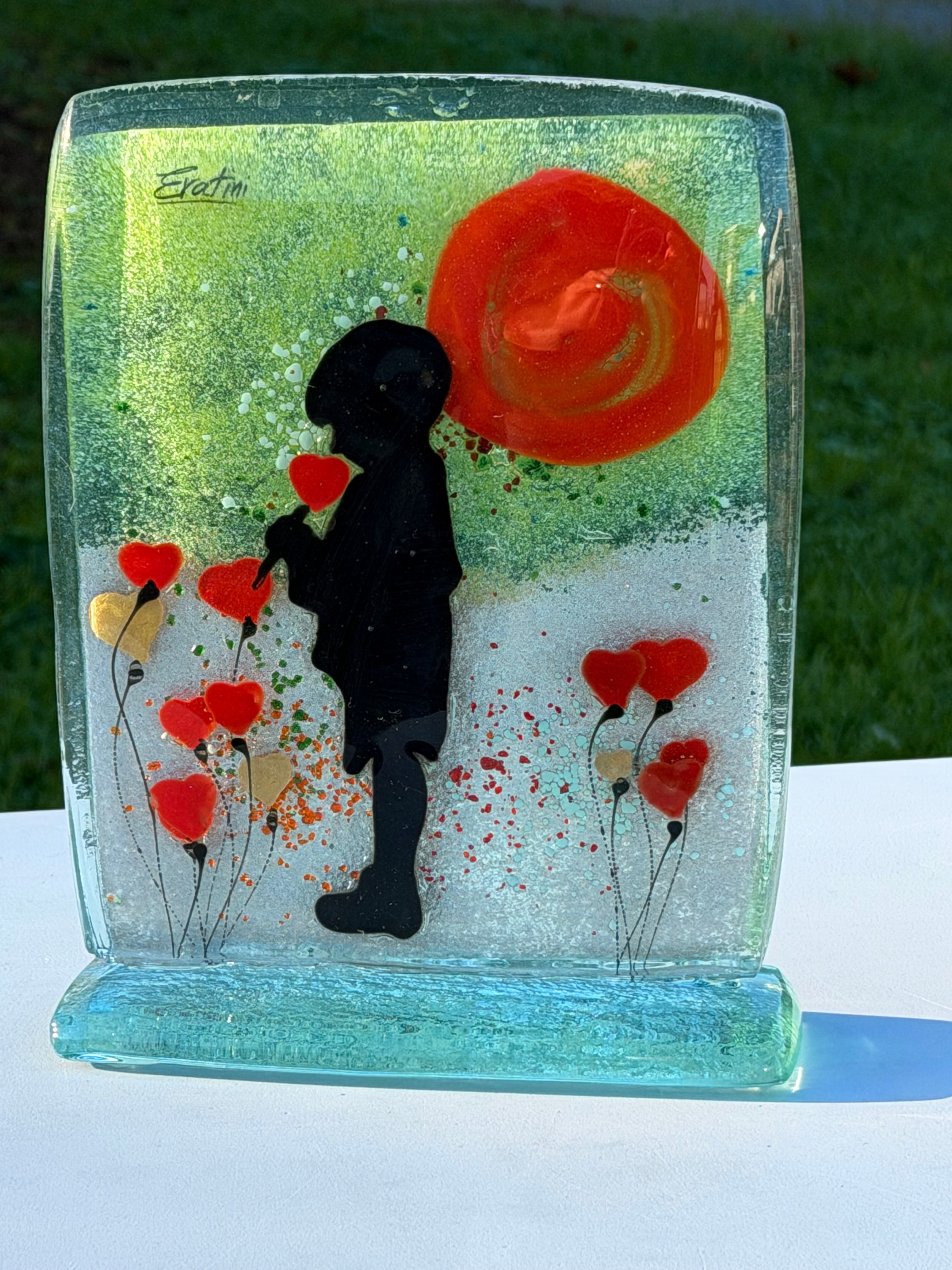 This beautiful and gentle design is applied on multiple layers of glass, which are then is fused together giving a 3 dimensional effect. This depth intensifies the way that light is magnified through the glass and emphasises the beautiful colours and metallic elements used to create this artistic glass collectible.