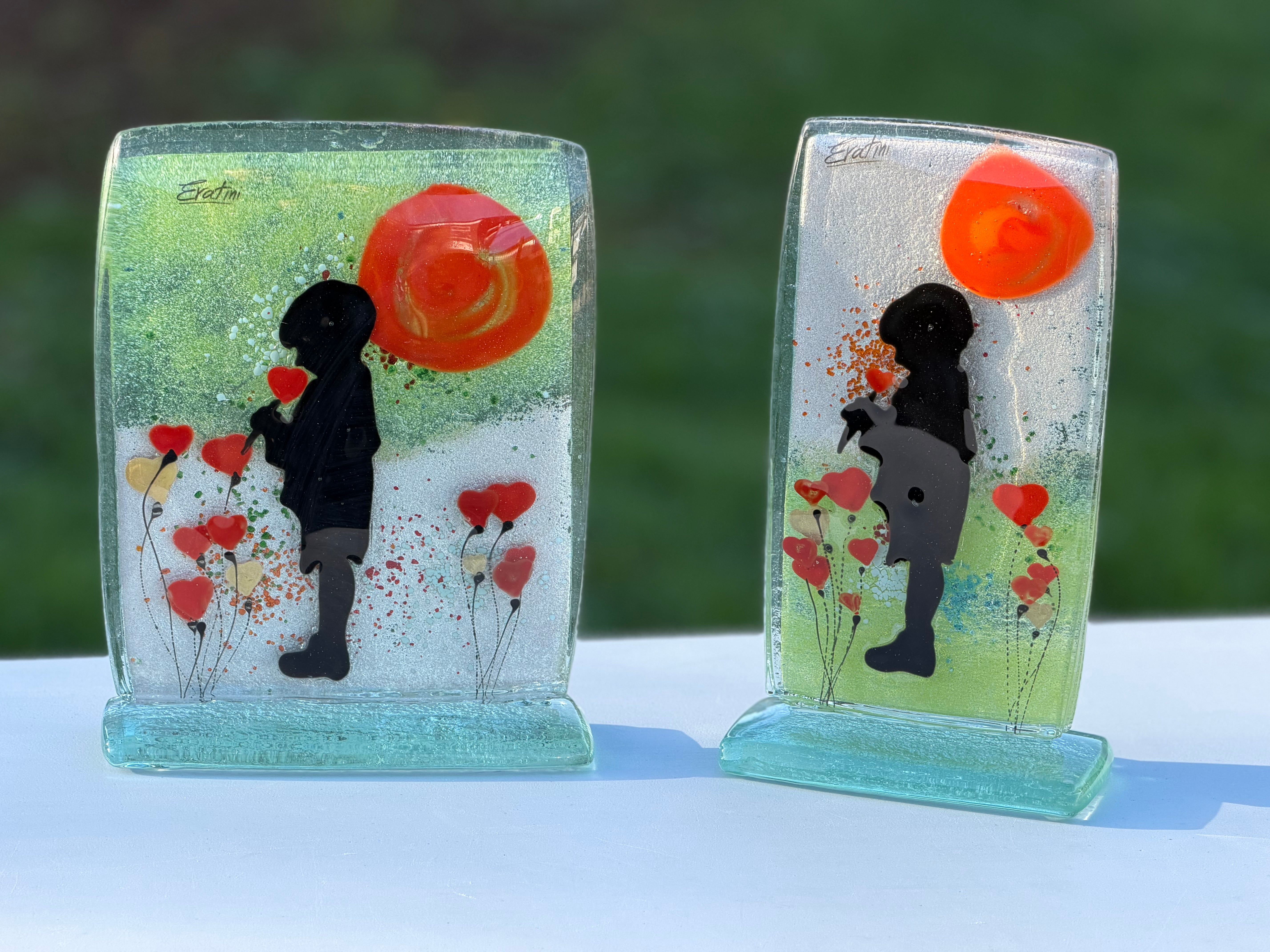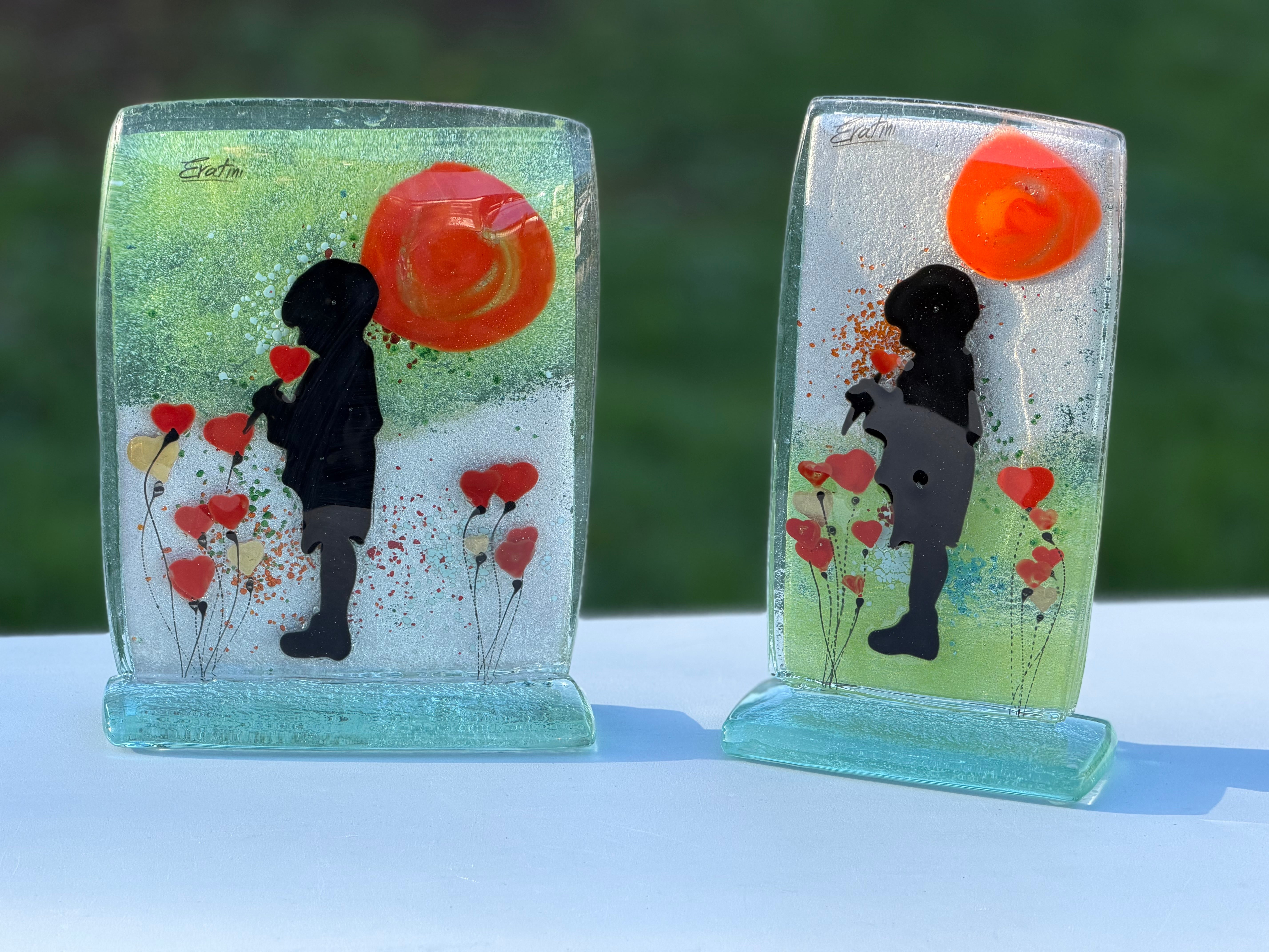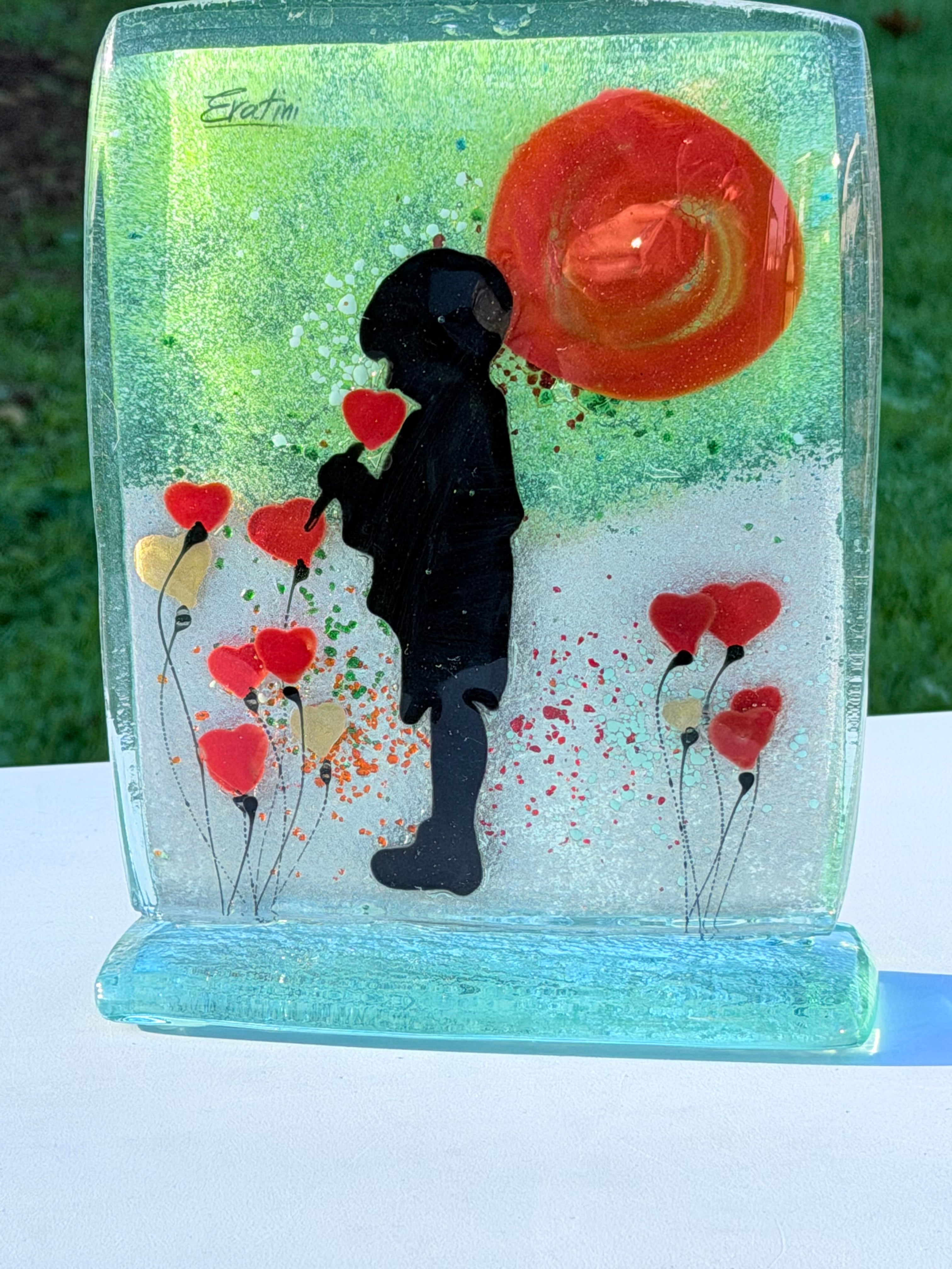This beautiful and gentle design is applied on multiple layers of glass, which are then is fused together giving a 3 dimensional effect. This depth intensifies the way that light is magnified through the glass and emphasises the beautiful colours and metallic elements used to create this artistic glass collectible.